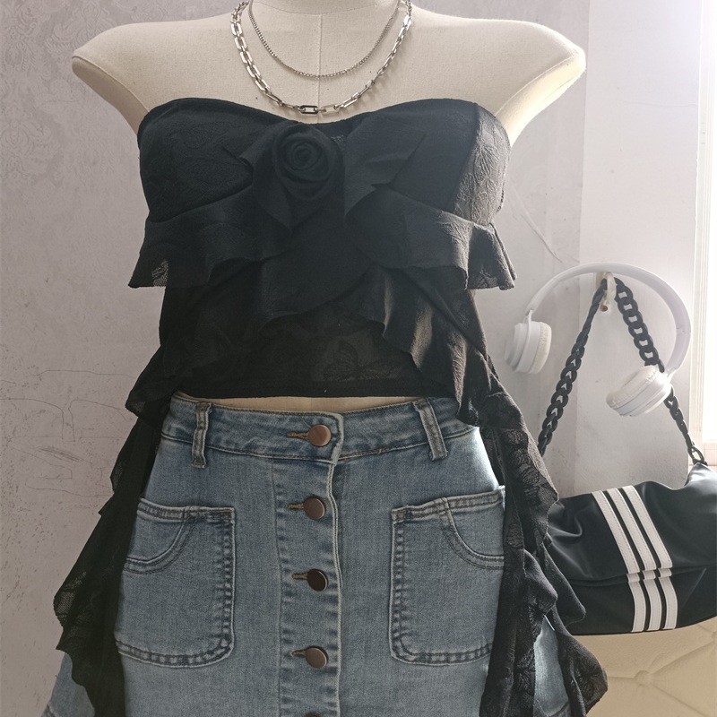 泰式甜辣荷叶边花朵无袖抹胸背心女夏季纯欲性感修身短款上衣外穿