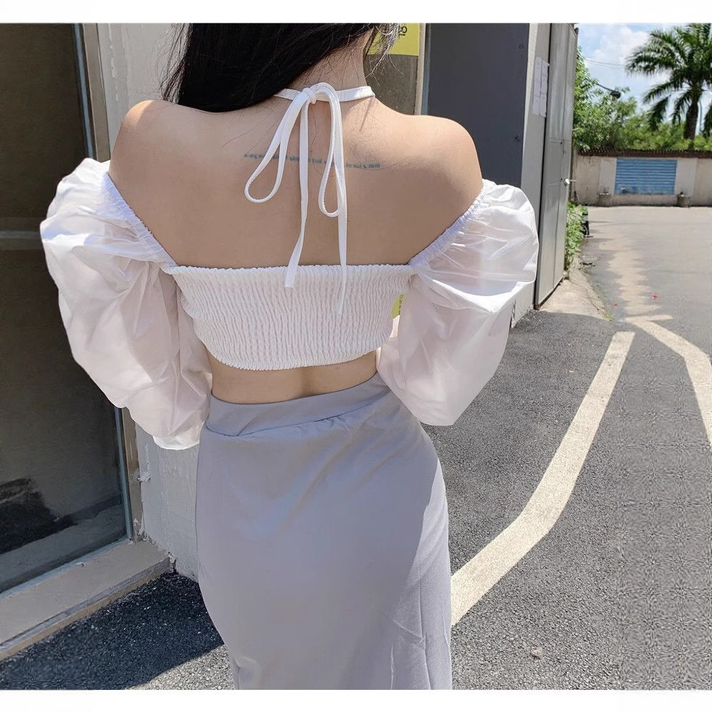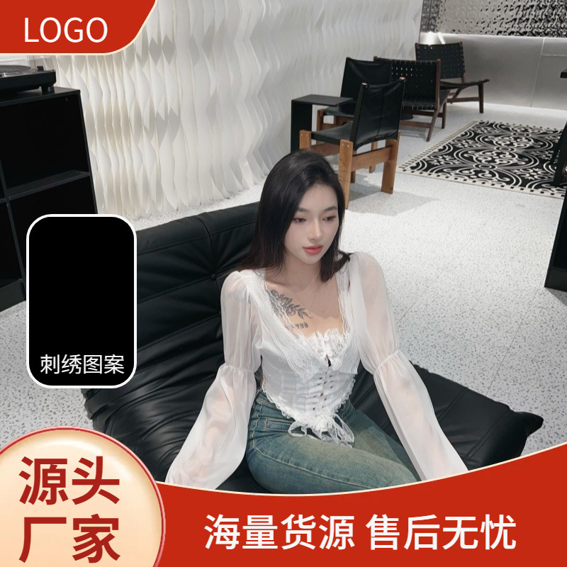 法式复古灯笼袖衬衫收腰短款衬衣纯欲风辣妹短款蕾丝雪纺上衣女装