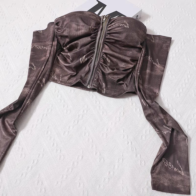 设计感美式辣妹性感一字肩拉链抹胸上衣女春秋季扎染长袖显瘦T恤
