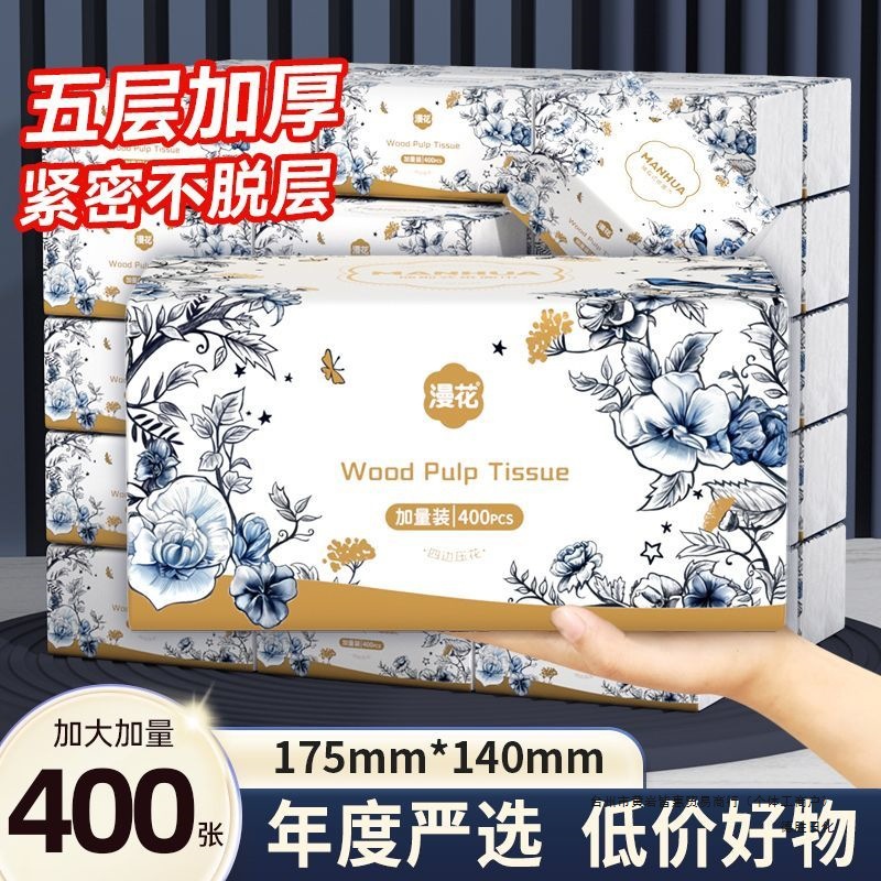 漫花大尺寸四边压花抽纸整箱批发家用卫生纸大包可湿水纸巾