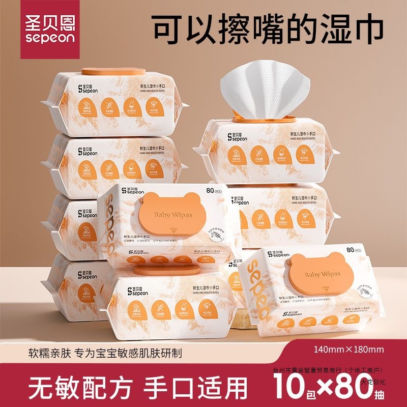 圣贝恩婴儿湿巾宝宝儿童手口擦屁股湿巾加厚带盖80抽10包整箱