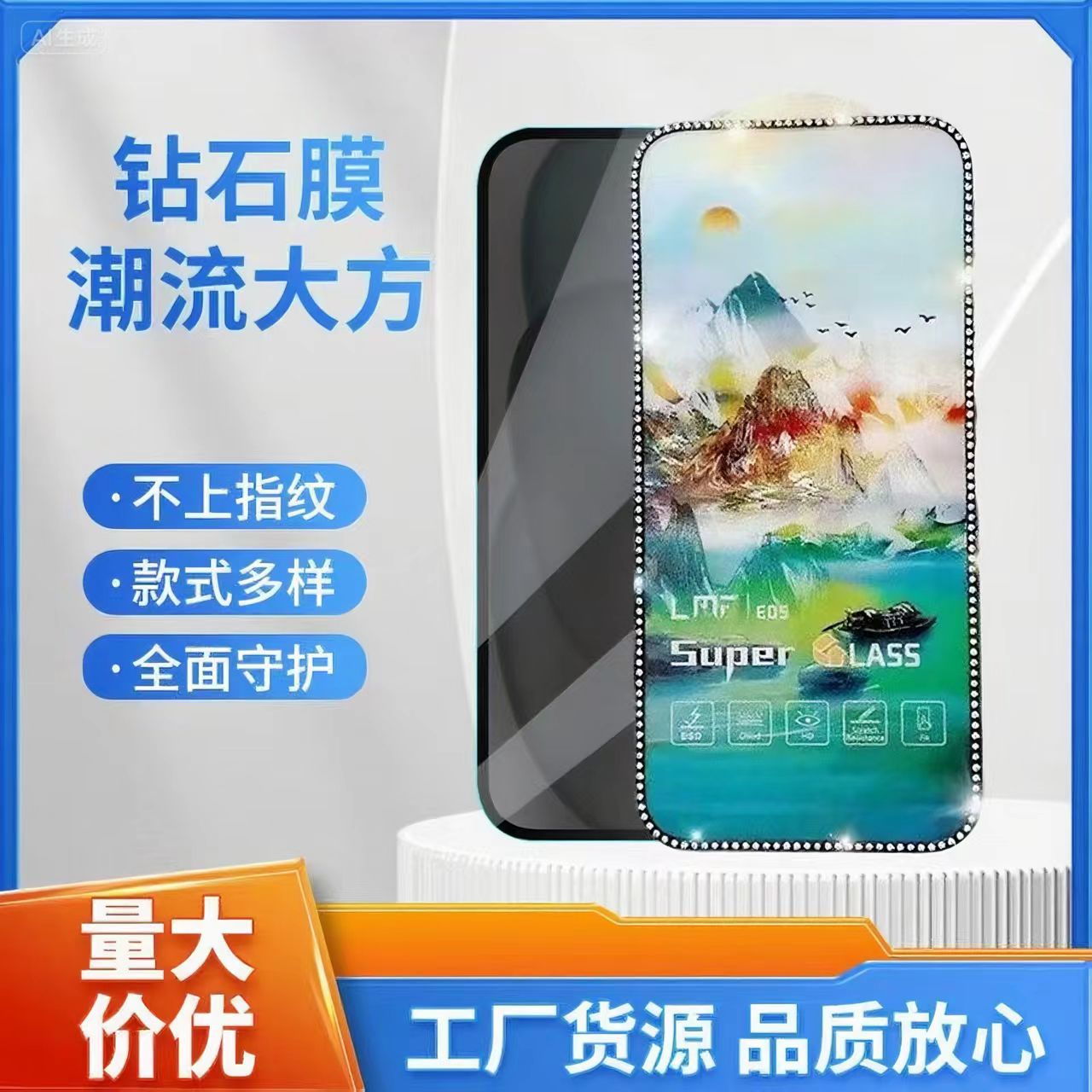 适用iPhone16Plus镶钻钢化膜晶钻石防窥15保护膜磨砂苹果13pro 12