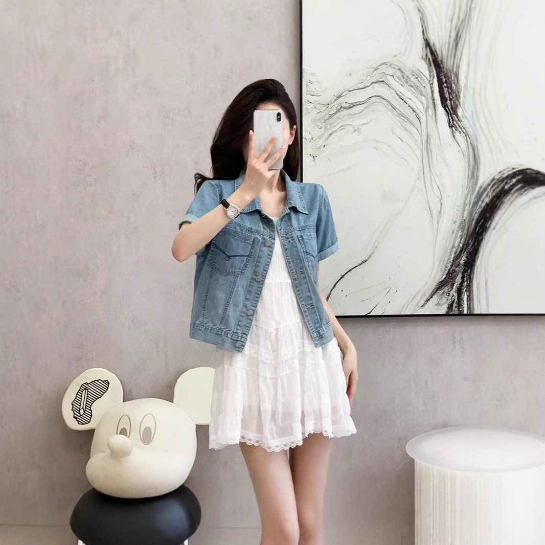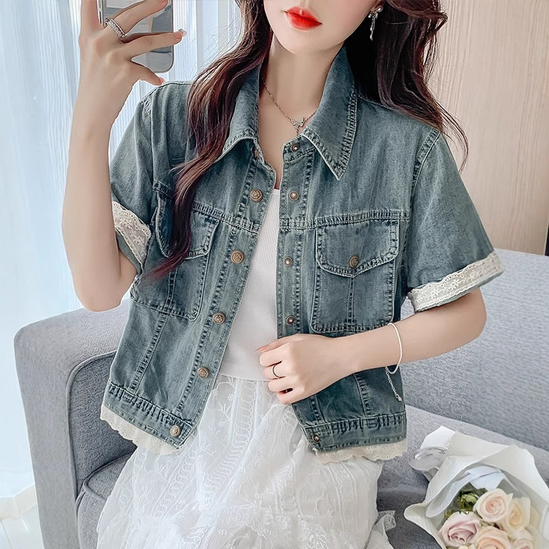 法式蕾丝花边拼接设计感短袖上衣女2025夏季新款牛仔外套短袖
