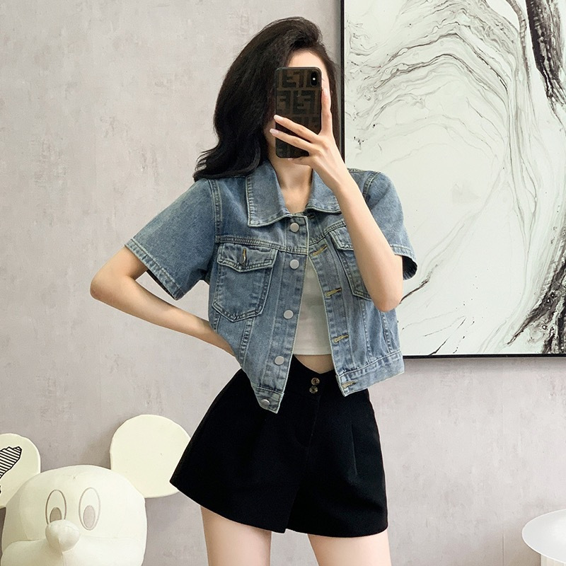 复古牛仔衬衫外套女短袖夏季宽松设计感百搭短款套装