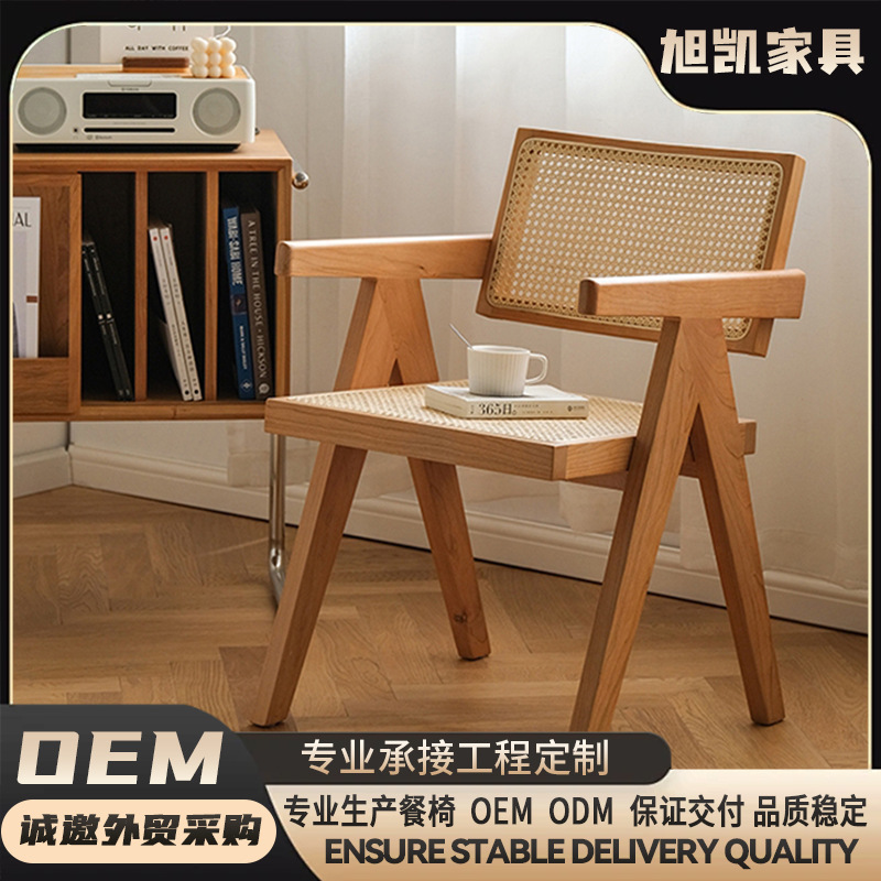 佛山工厂实木藤编中古风餐桌椅子阳台昌迪加尔日式家用扶手椅餐椅