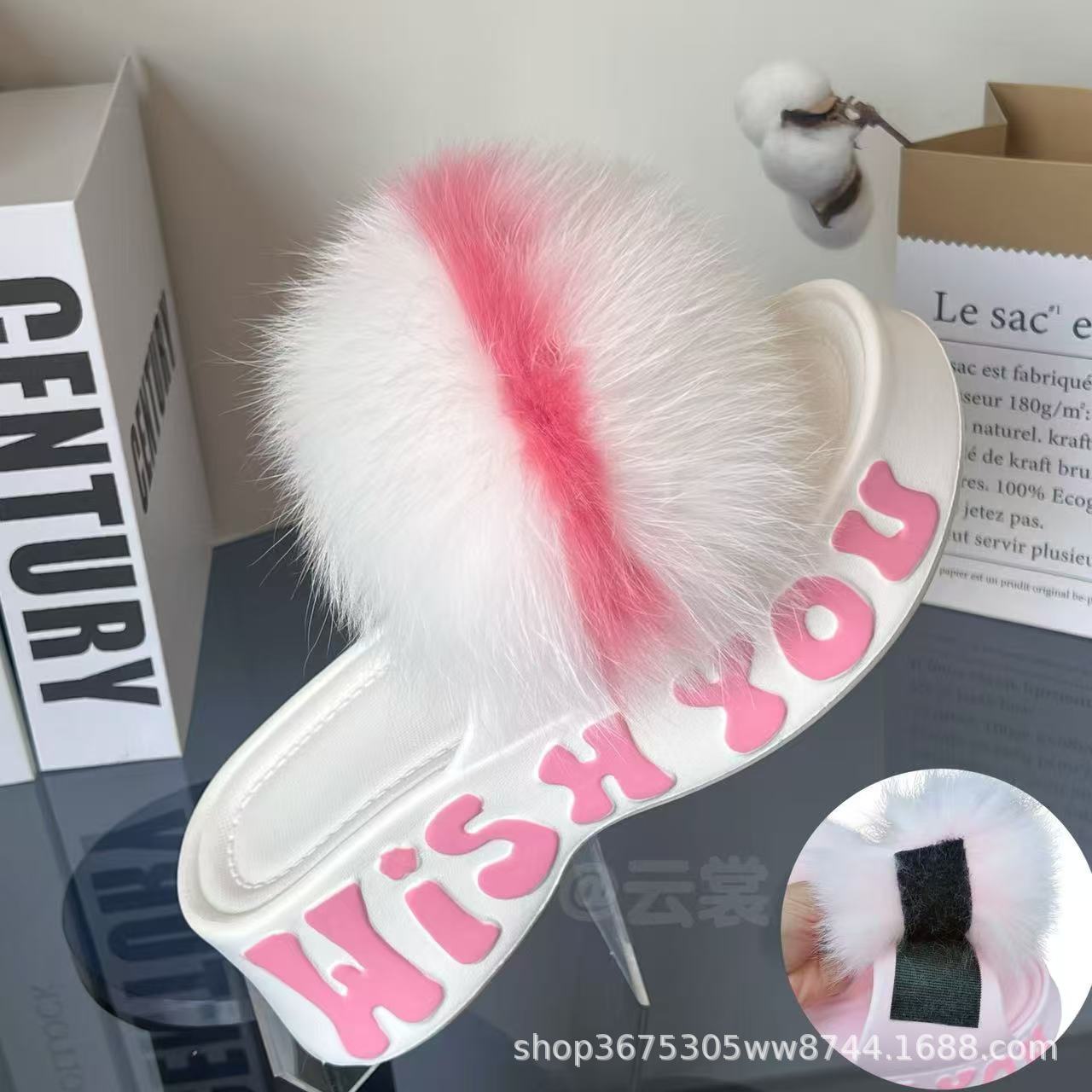跨境狐狸毛拖鞋女士一字拖批发室内居家平底皮草凉拖防滑毛绒拖鞋