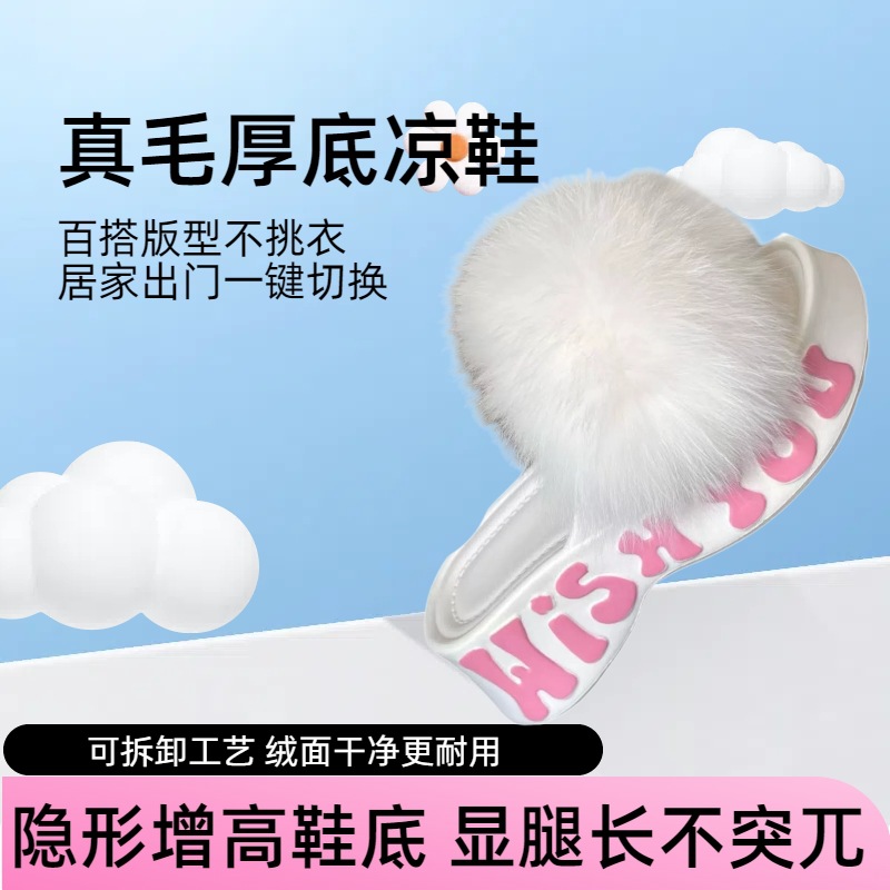 2025新款便携厚底毛毛拖鞋狐狸毛可拆卸女外穿增高一字真皮草毛拖