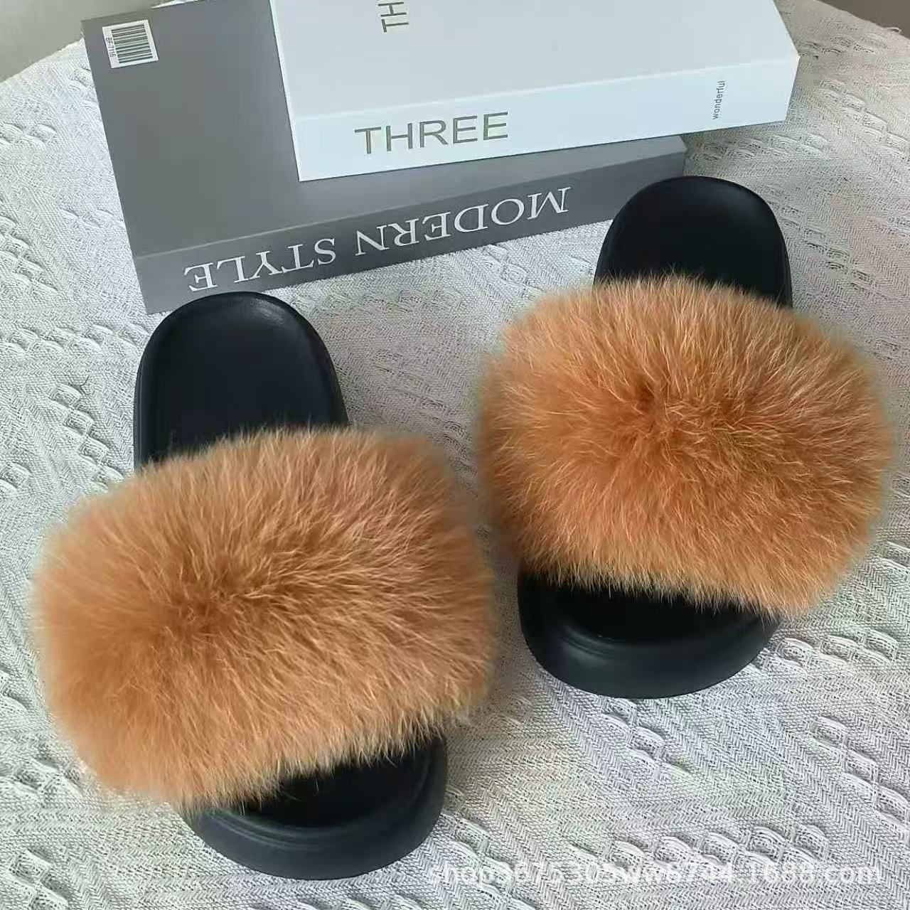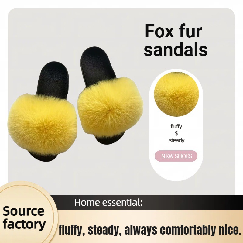 跨境款毛毛拖鞋女夏外穿居家平底一字拖真狐狸毛皮草凉拖百搭舒适