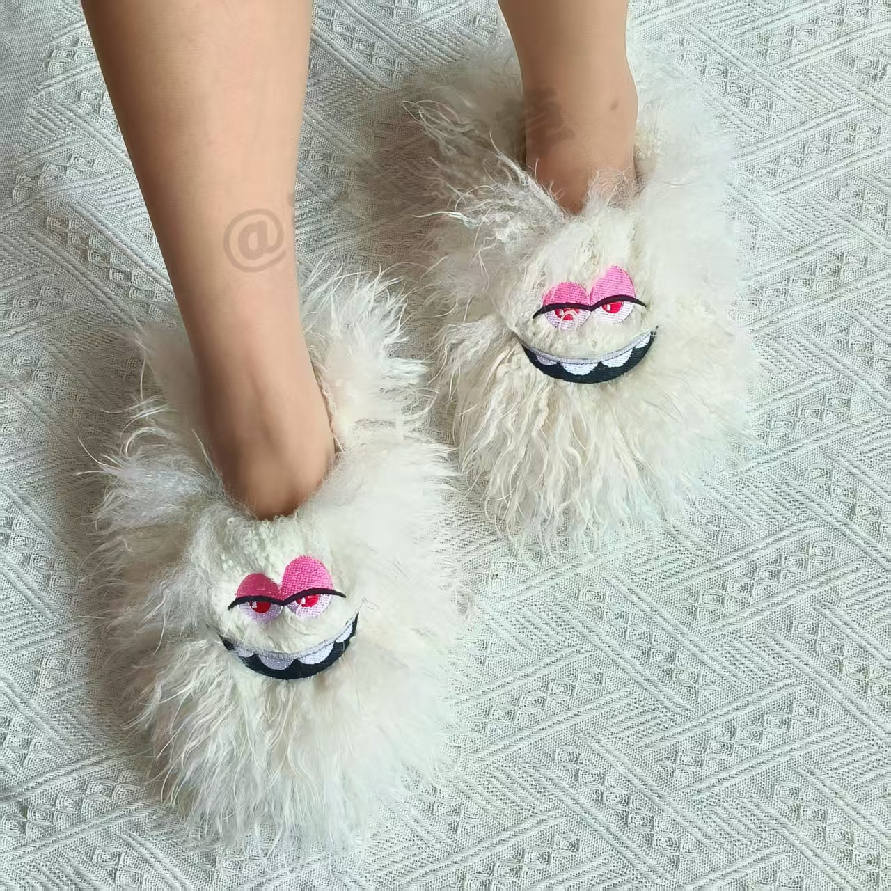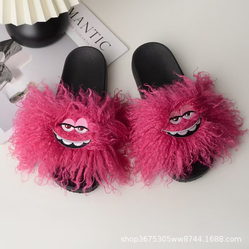 跨境爆款仿羊毛刺绣皮草女士拖鞋秋冬季毛毛拖鞋人造毛绒笑脸怪兽