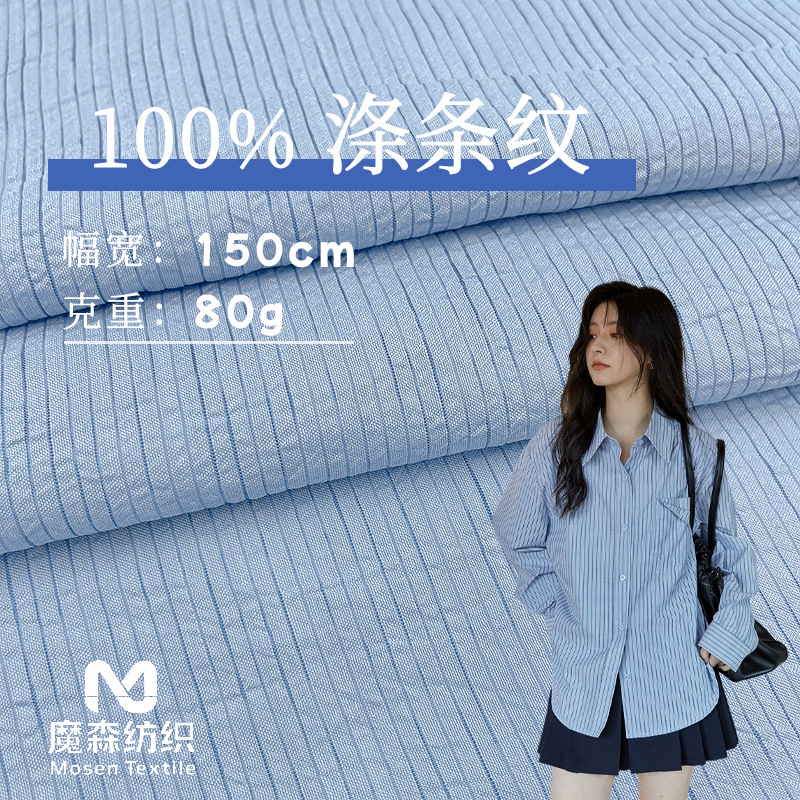 现货 清新浅蓝竖条纹肌理面料 微皱质感 夏季女装衬衫连衣裙布料