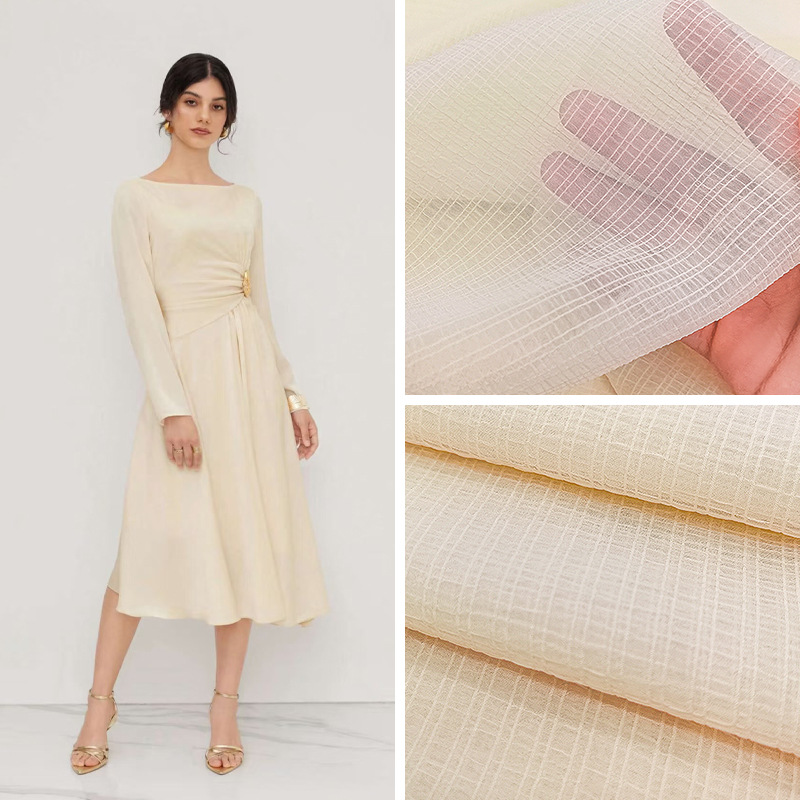 现货直销 褶皱欧根纱面料 春夏天丝锦纶混纺时装女装连衣裙布料