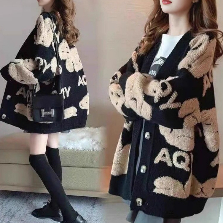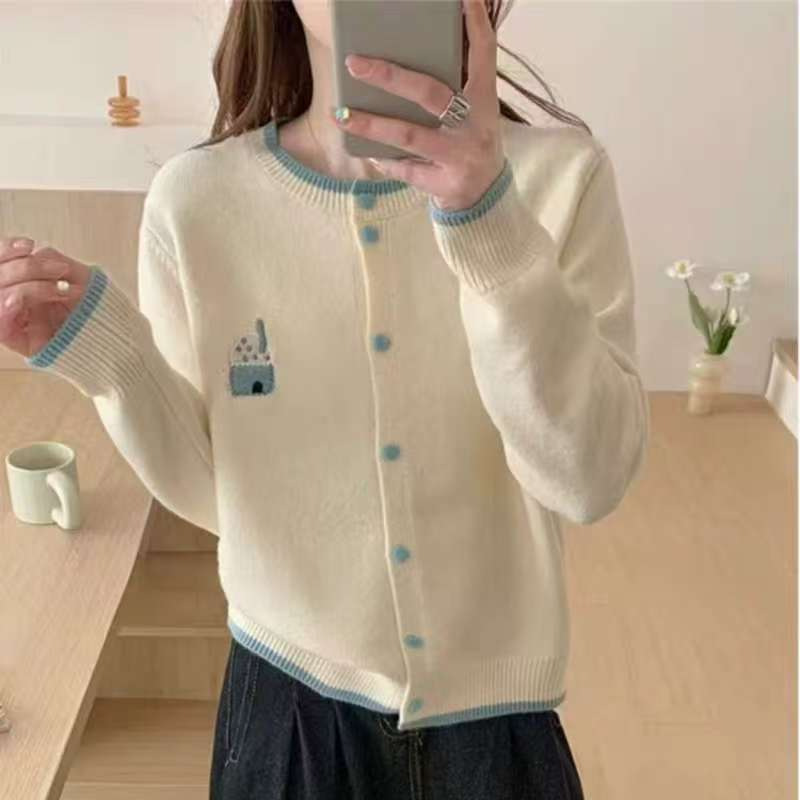 新品2025秋冬季欧货圆领卡通刺绣氛围感慵懒感开衫女毛衣外套针织