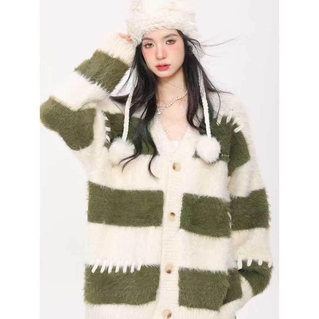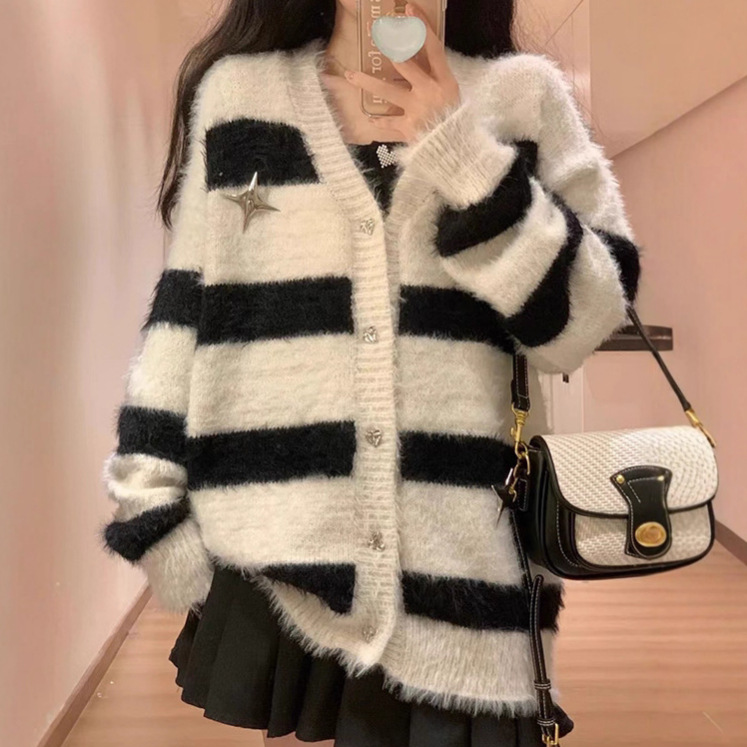 2025秋冬季新款韩系穿搭学院风条纹开衫毛衣女仿水貂绒软糯针织衫