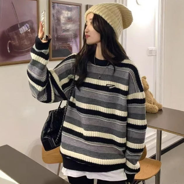 韩国chic2025新款秋冬复古慵懒宽松圆领女撞色条纹针织衫套头上衣