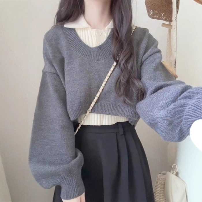 灰色polo领撞色套头设计针织衫女秋冬毛衣背心两件套修身短款上衣