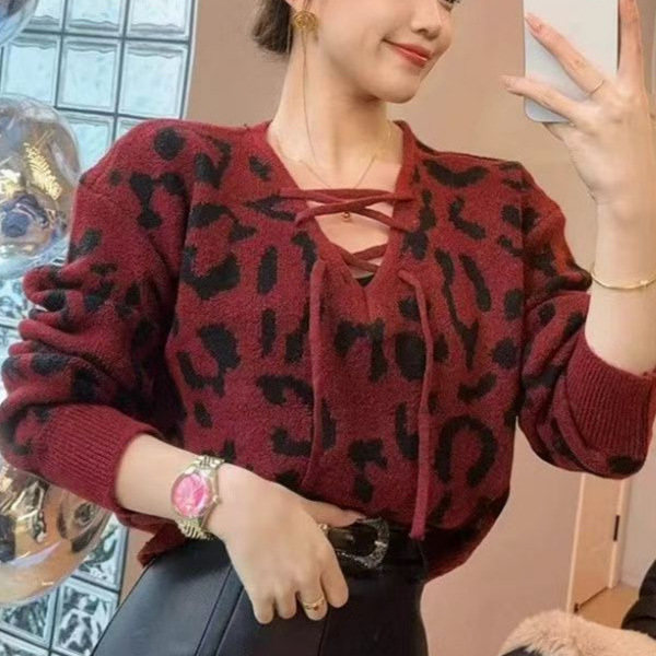 2025秋冬新款豹纹穿绳设计感针织衫上衣韩版宽松软糯毛衣套头女潮