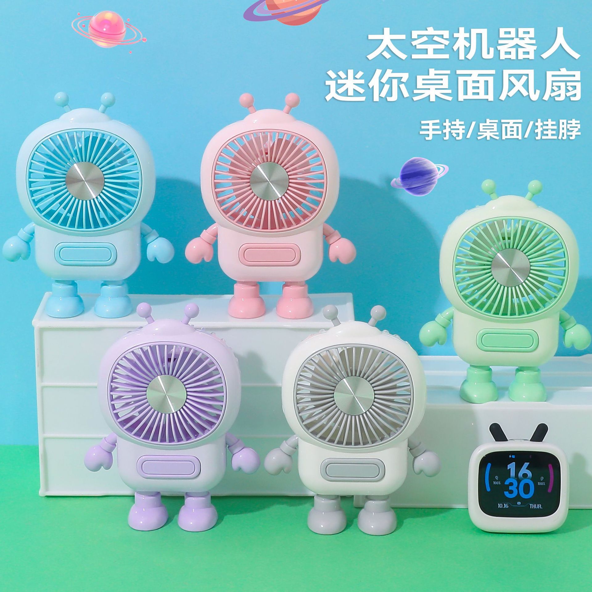 爆款创意机器人手持迷你充电风扇 带挂绳户外挂脖学生便携三档