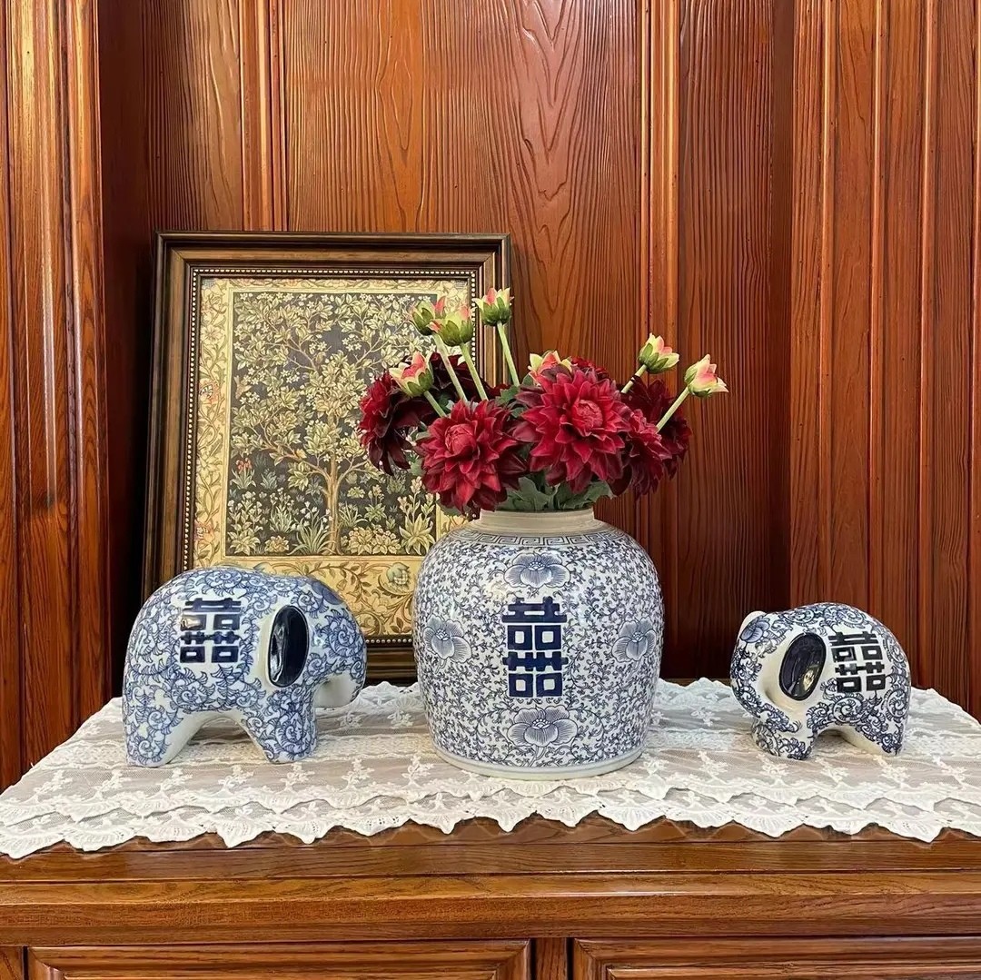 景德镇明清古典中式青花喜字系列陶瓷罐仿古做旧客厅玄关瓷器摆件