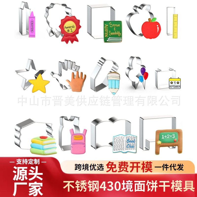 返校季不锈钢饼干模具铅笔蜡笔黑板书包一体按压式烘焙工具跨境