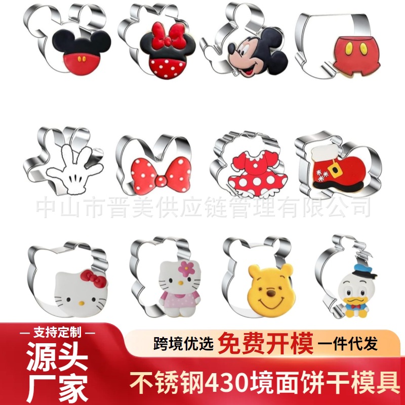 10件米奇饼干模具米妮造型儿童生日派对不锈钢蛋糕工具按压式跨境