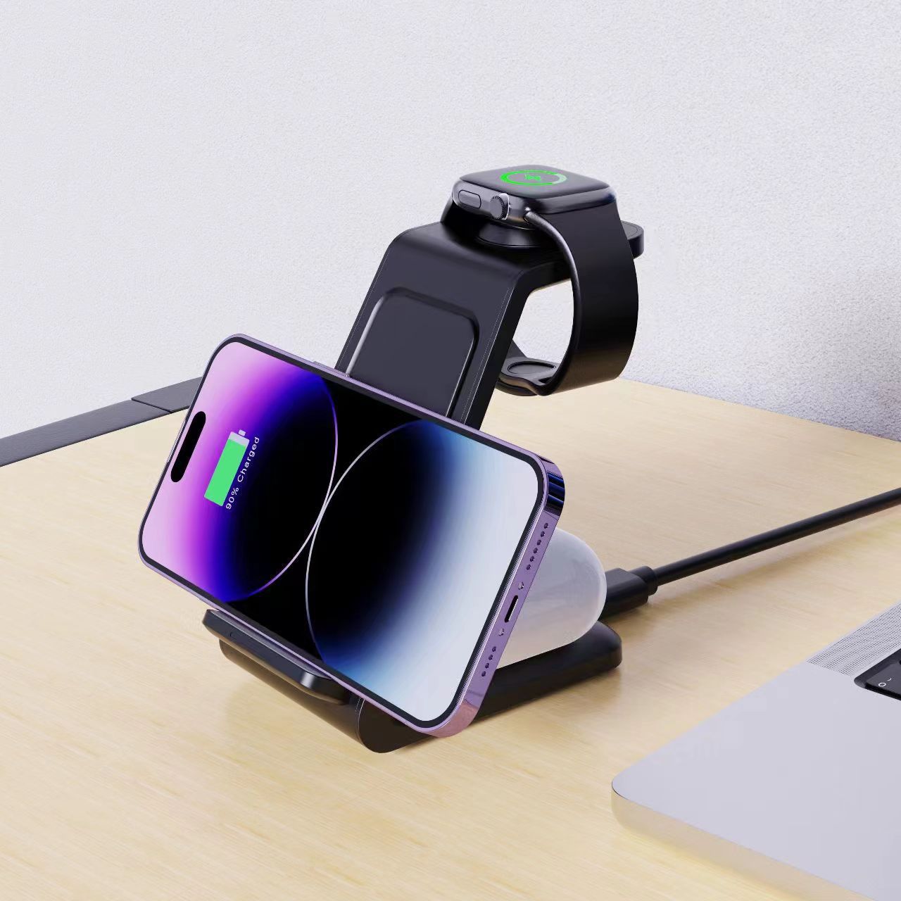 跨境电商热卖立式三合一桌面无线充电器手机手表耳机三台设备同时