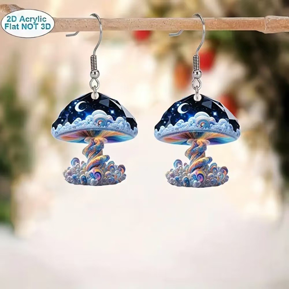 跨境异想天开2D亚克力蘑菇月亮吊坠耳环不锈钢耳针日常可爱卡通女