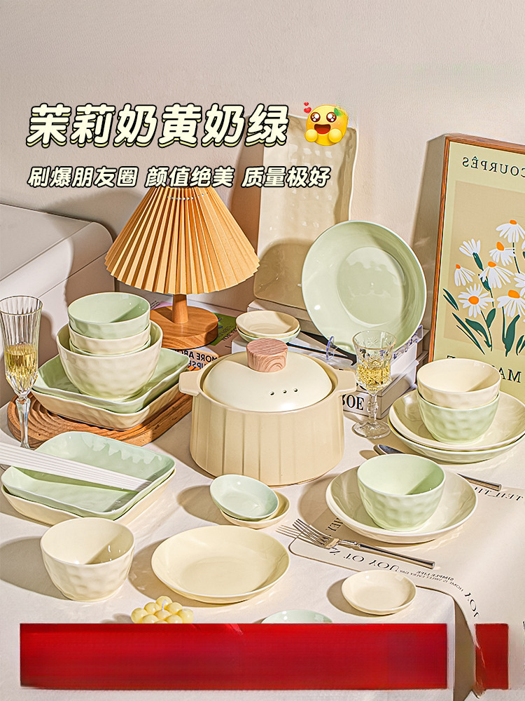 奶油风碗碟套装家用2025新款高颜值釉下彩餐具套装乔迁碗盘筷碗具