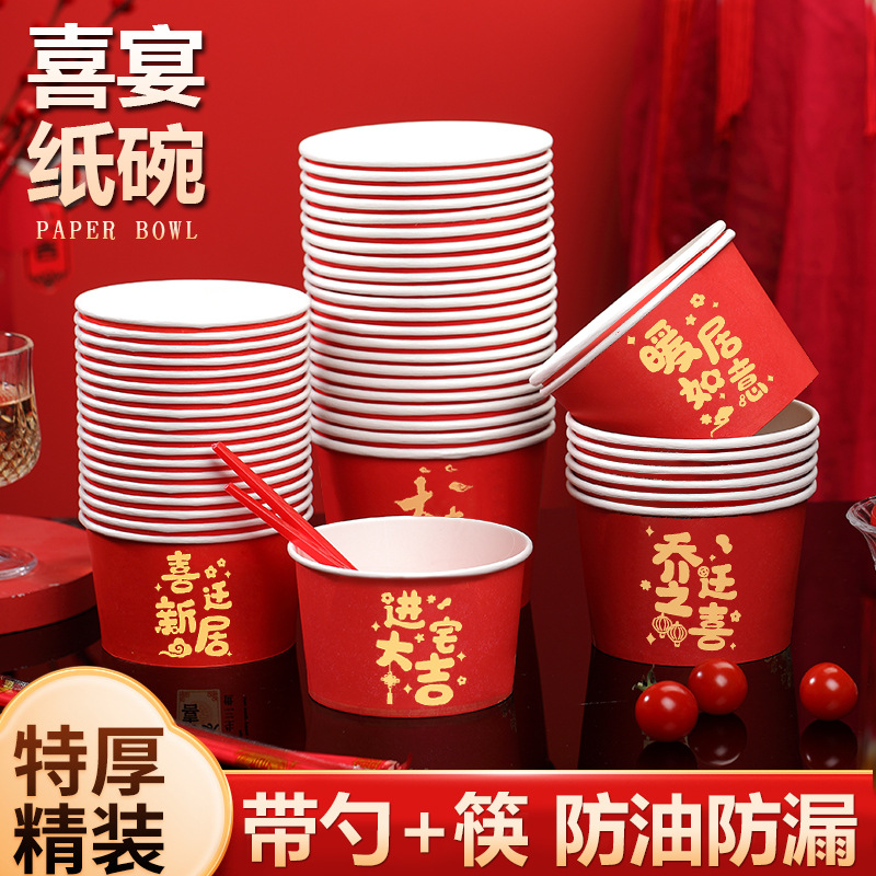 结婚一次性红碗婚宴加厚喜碗婚庆食品级家用纸碗筷餐具套装婚礼酒