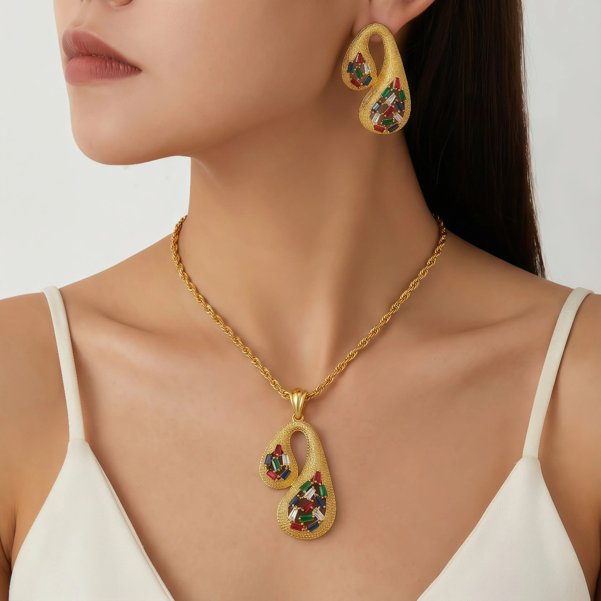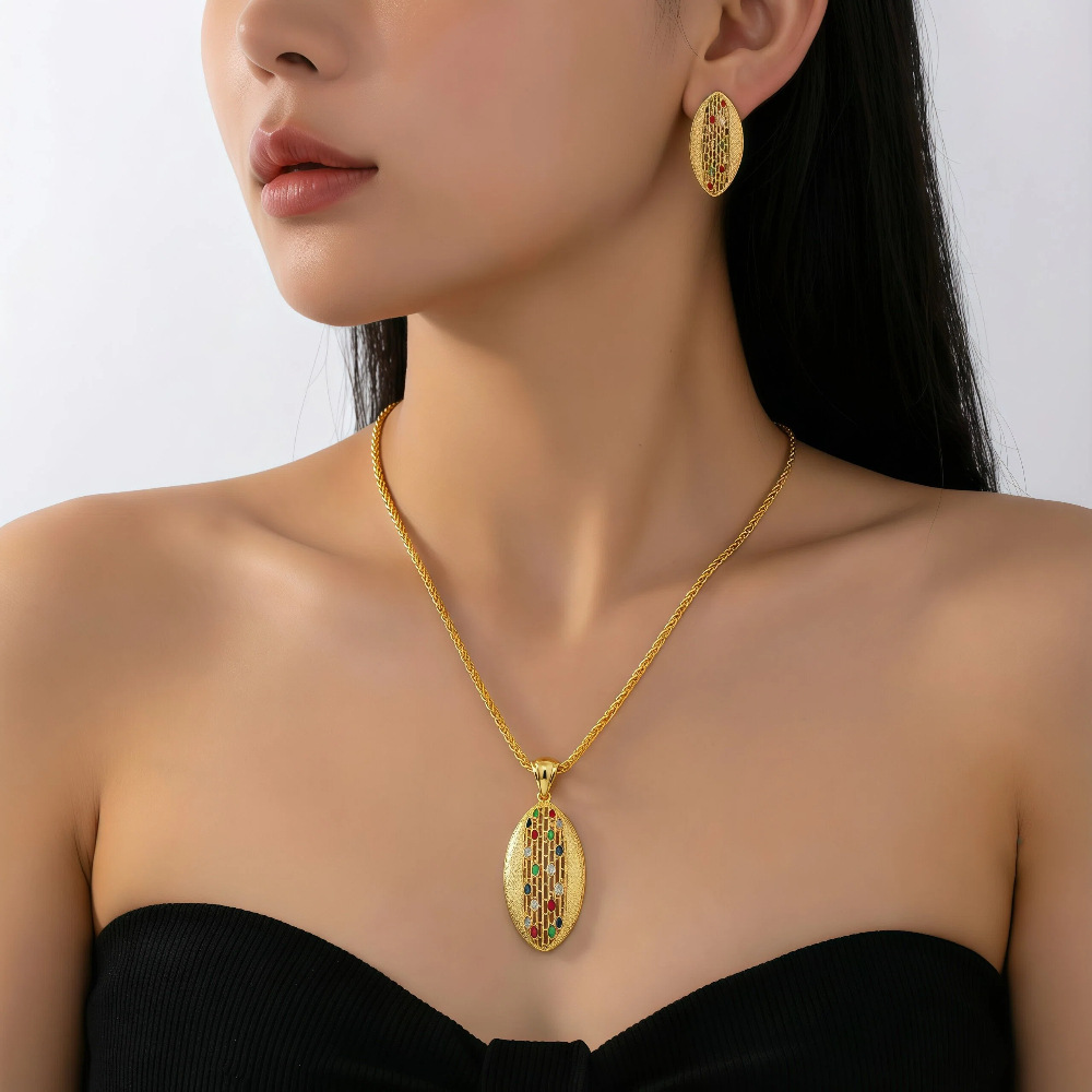 欧美跨境金色时尚创意首饰套装黄铜锆石轻奢耳饰吊坠项链可定 制