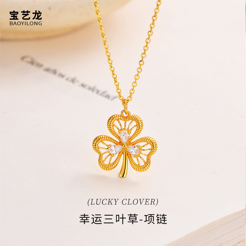 幸运三叶草925纯银项链女高级感镶锆石拉丝戒指爱心耳钉饰品套装
