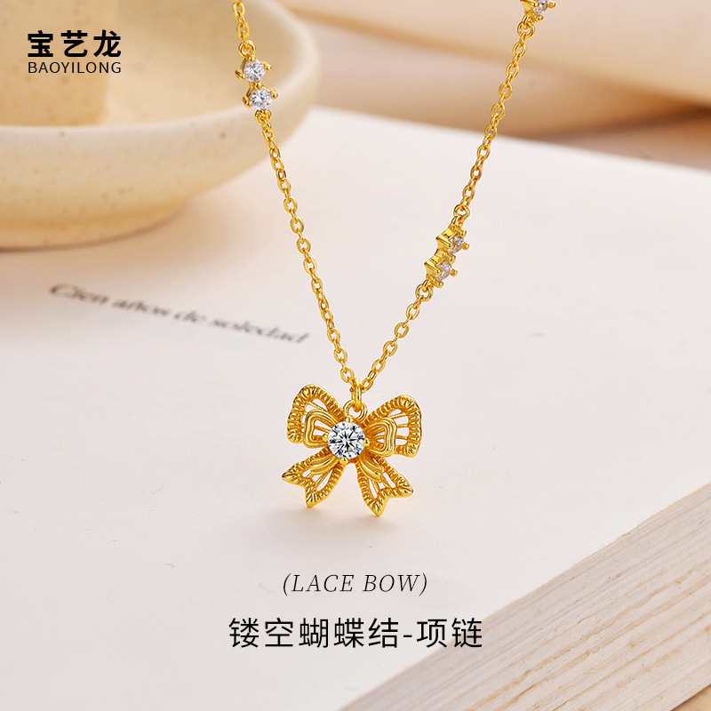 镂空蝴蝶结925纯银项链女高级感锆石时尚胸链十字链珠宝饰品配饰