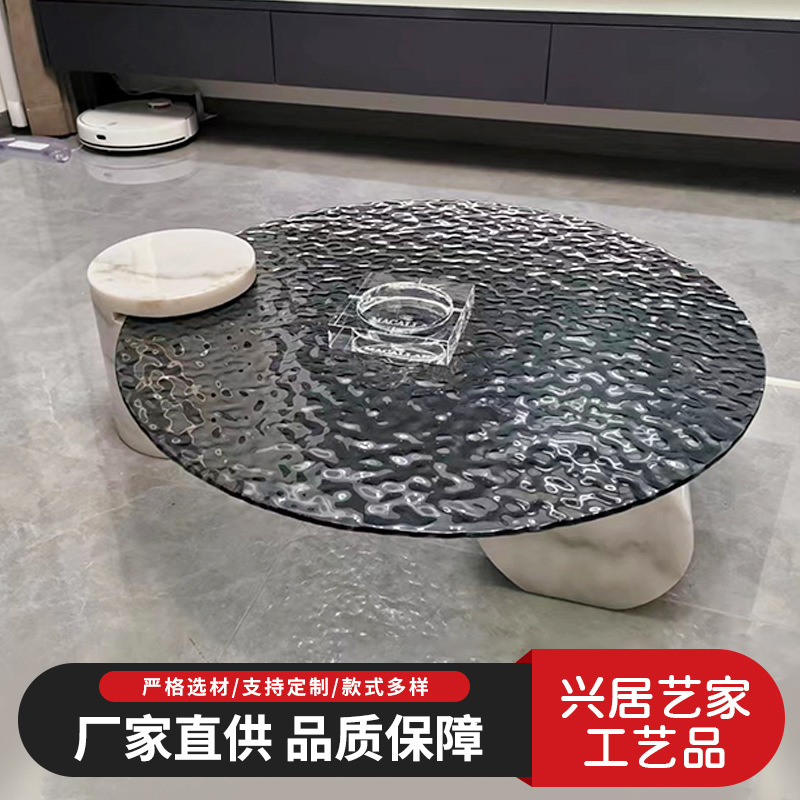 意式轻奢Baxter设计师天然大理石水波纹茶几热熔圆形玻璃现代简约