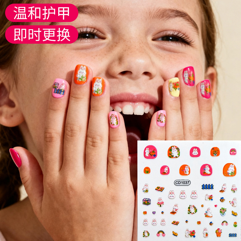 儿童美甲全贴贴花安全无毒可爱卡通动物图案防水防污派对日常装饰