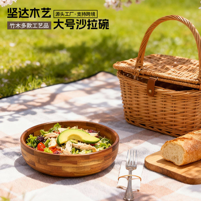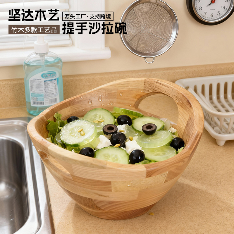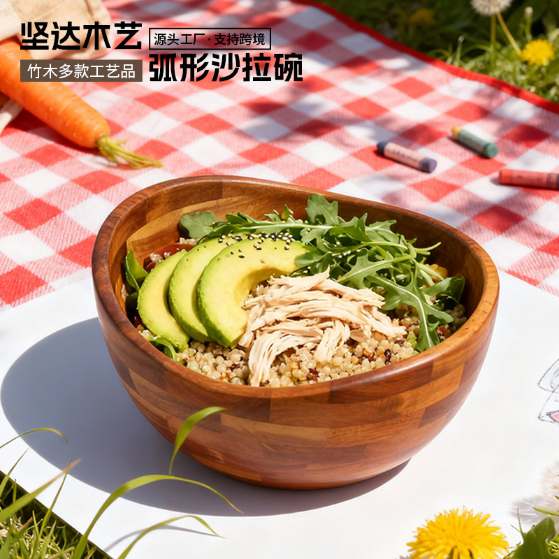 外贸木质家用餐具 弧形橡胶木沙拉碗带提手防水防烫素食碗野餐碗