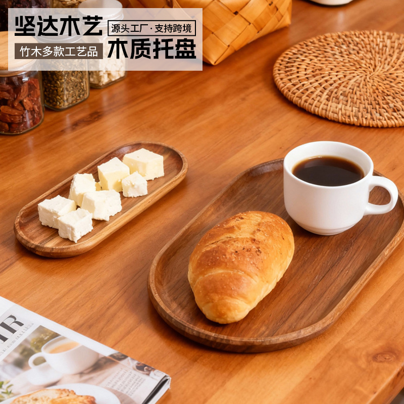 日式复古木质托盘 相思木椭圆形托盘多规格订单印刷LOGO木艺托盘
