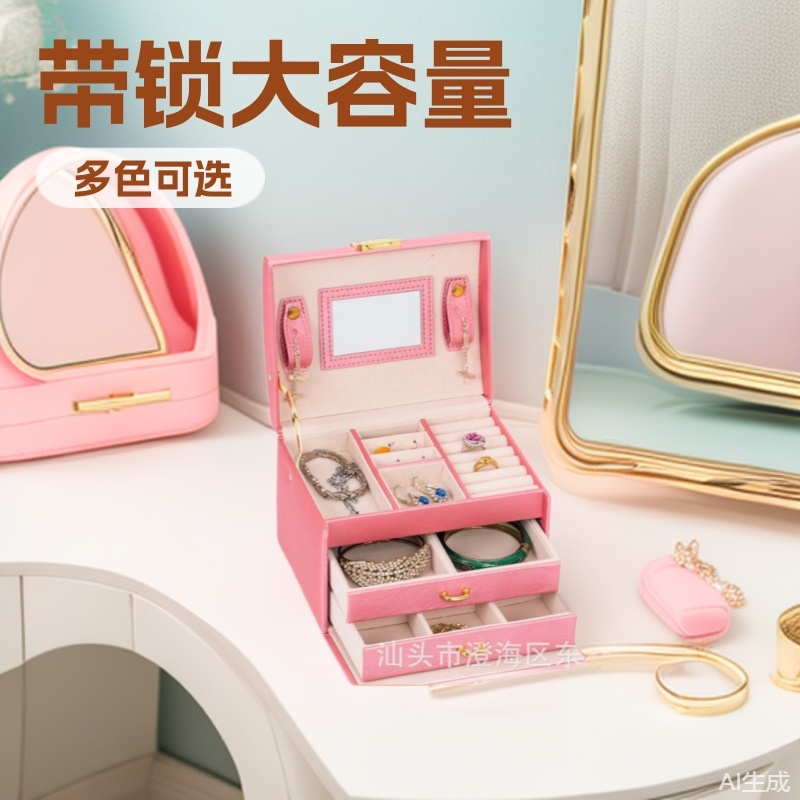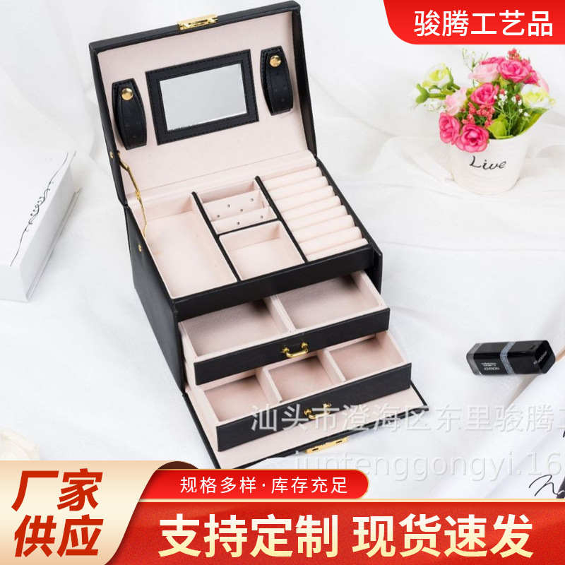 现货多层带锁首饰盒PU材质戒指项链收纳盒家用珠宝箱大容量包装盒