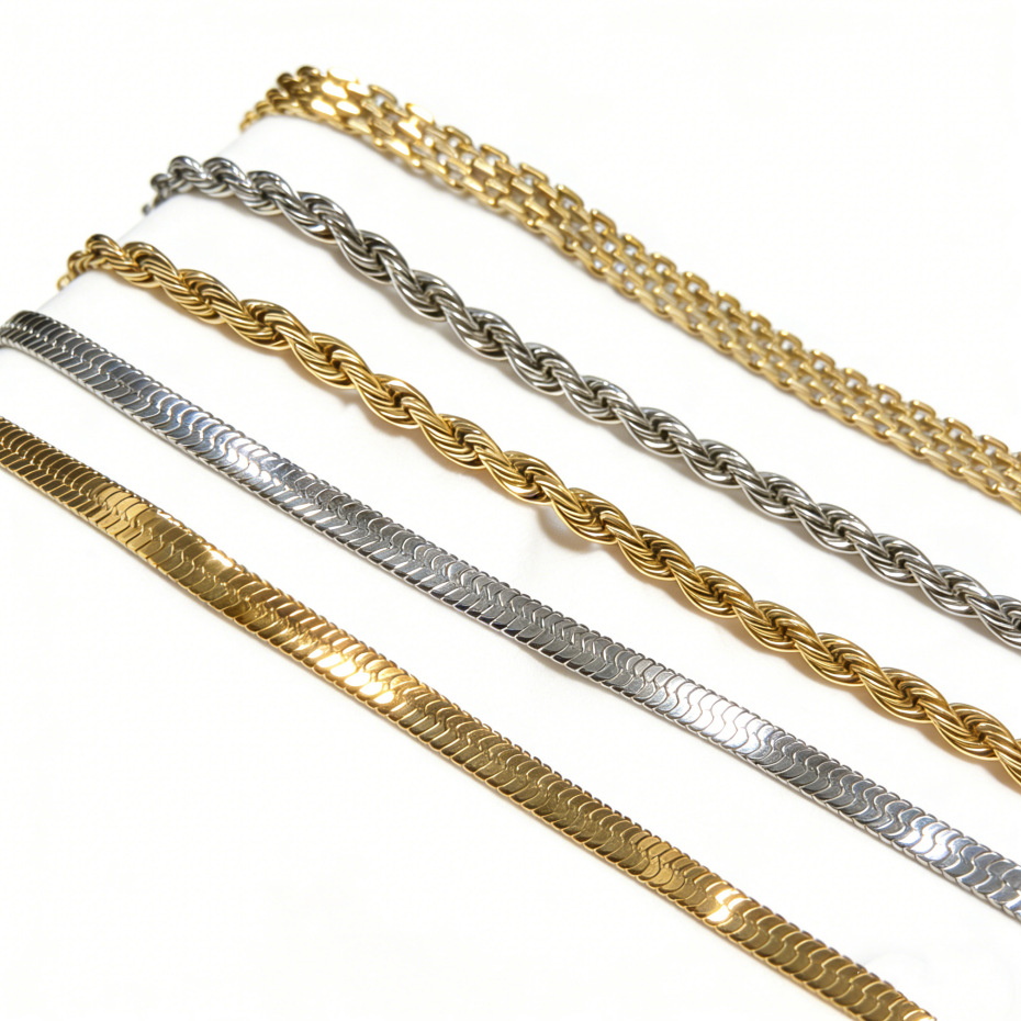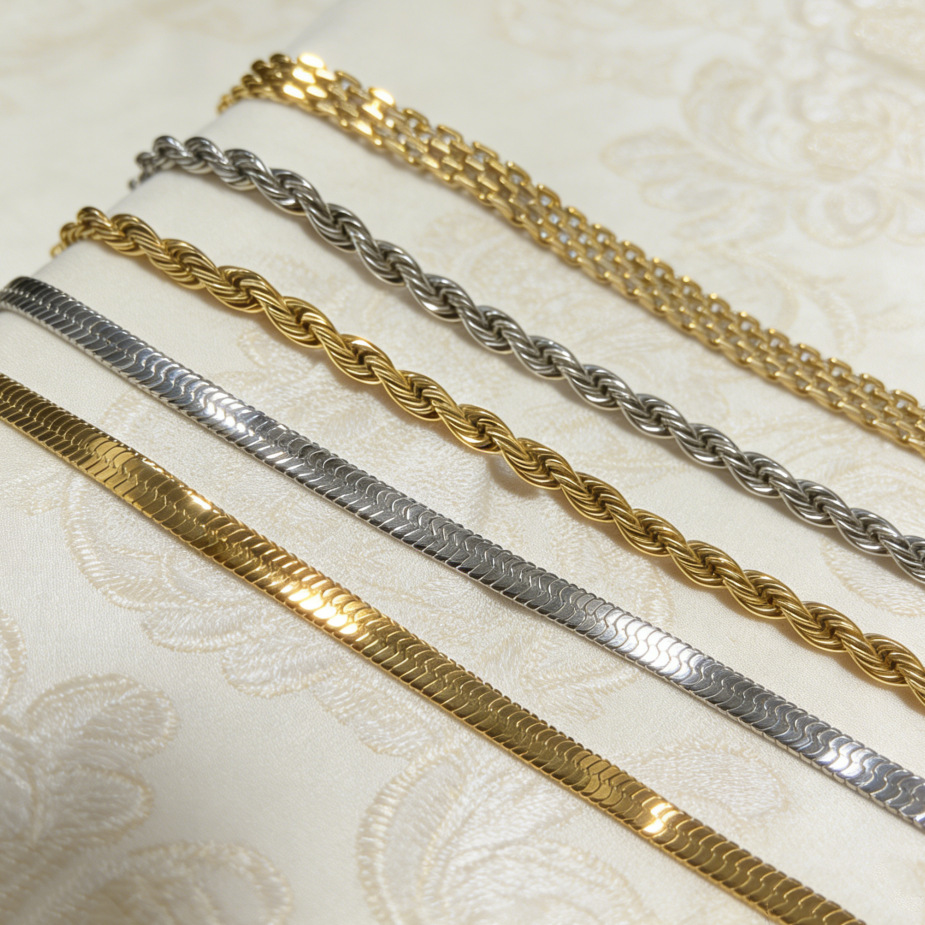 | 颜色 | 扁蛇骨链钢色手链 | 颜色 | 麻花链金色手链 |