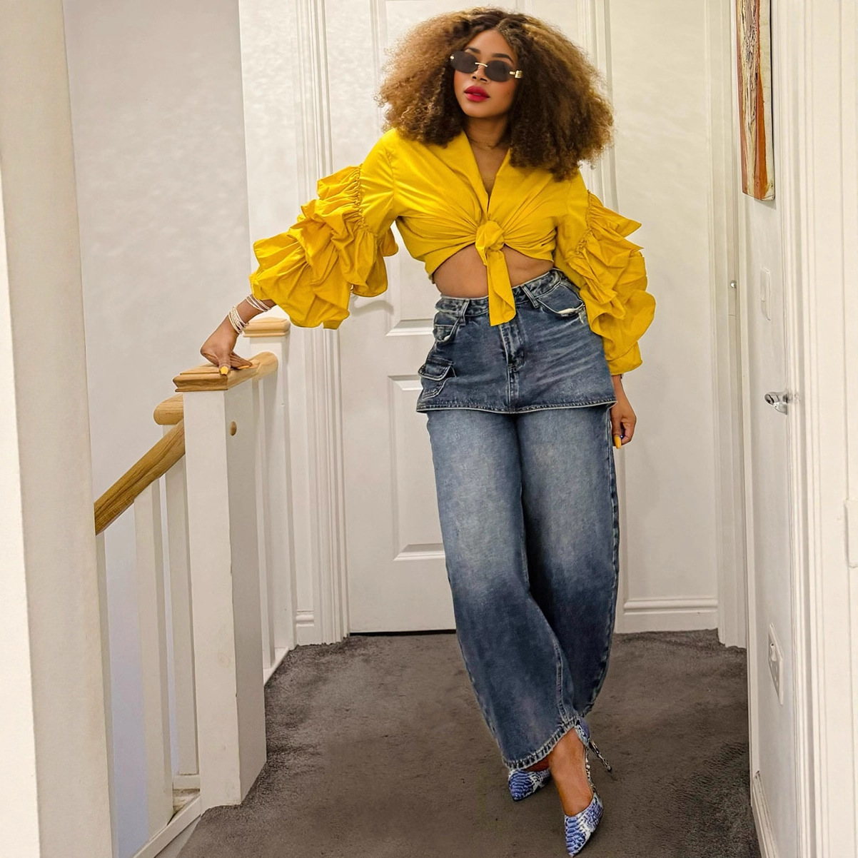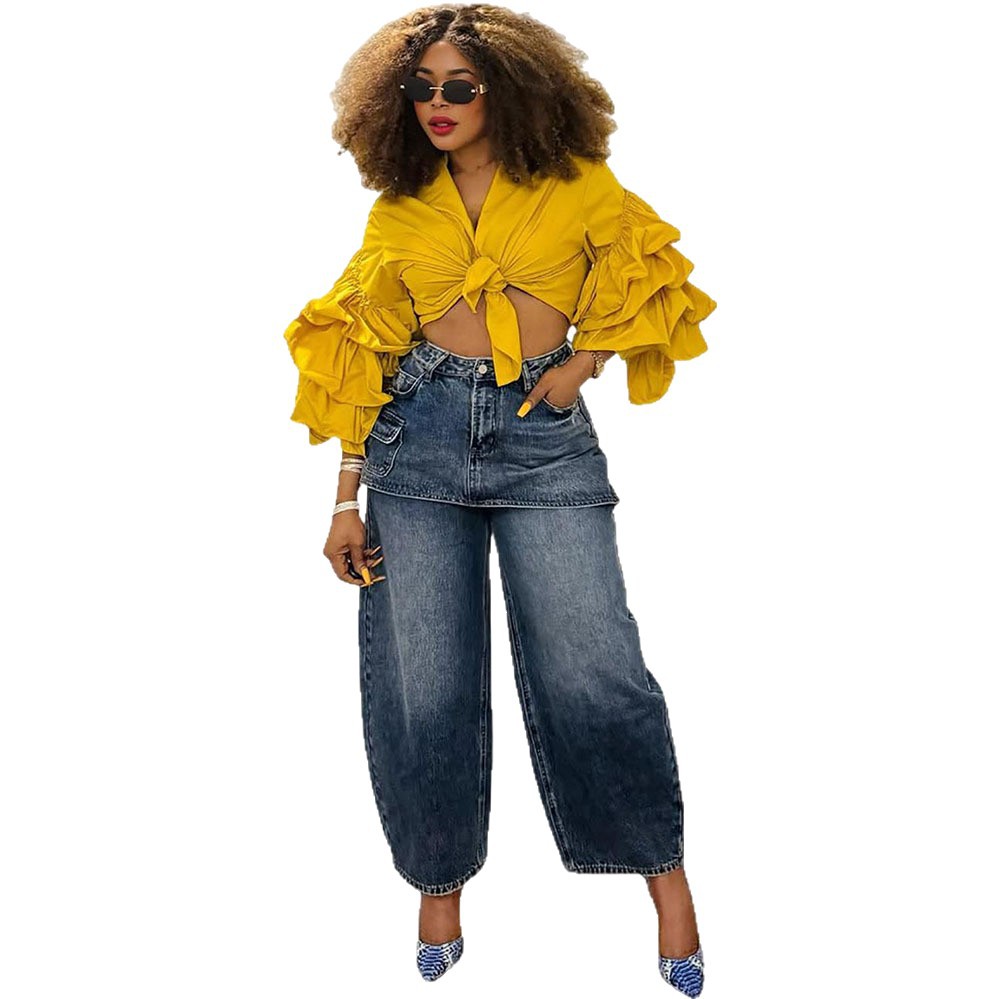 欧美女式假裙牛仔裤亚马逊跨境女装时尚个性拼接高腰短裙直筒长裤