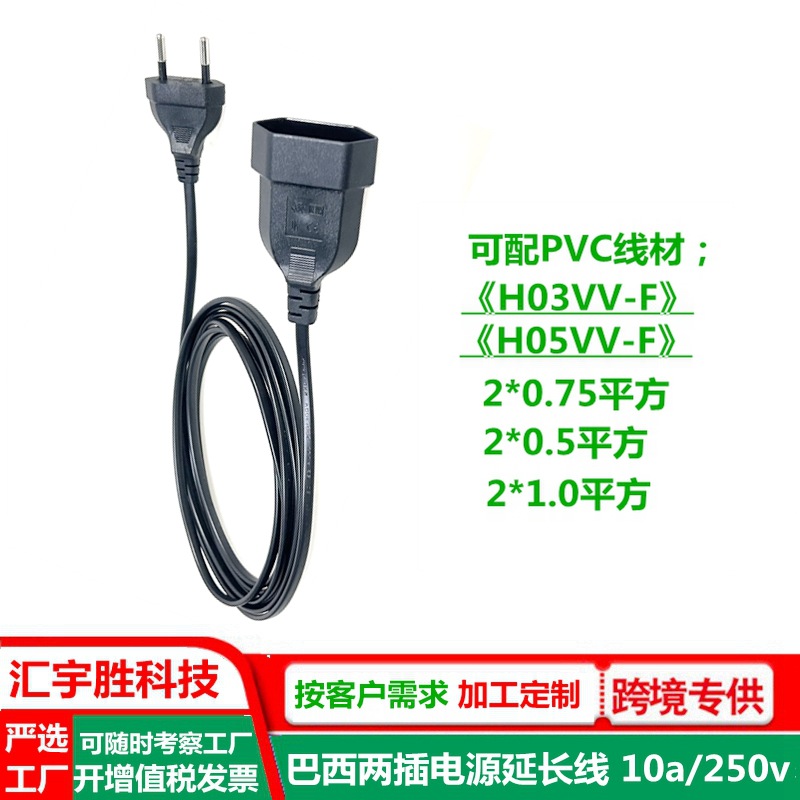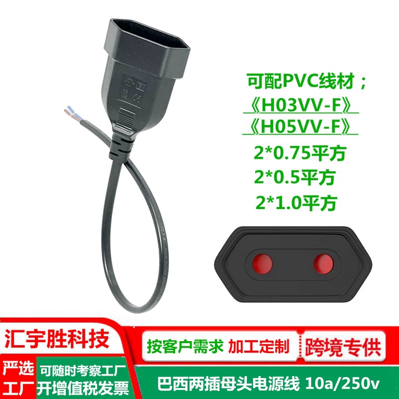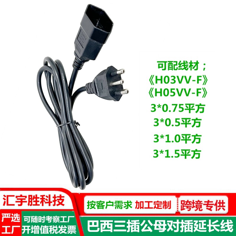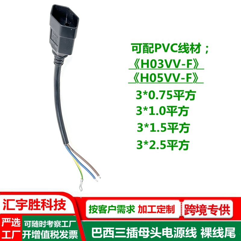 巴西三插母头线 巴西规3孔母头电源线 裸尾 巴西标叁芯插头延长线