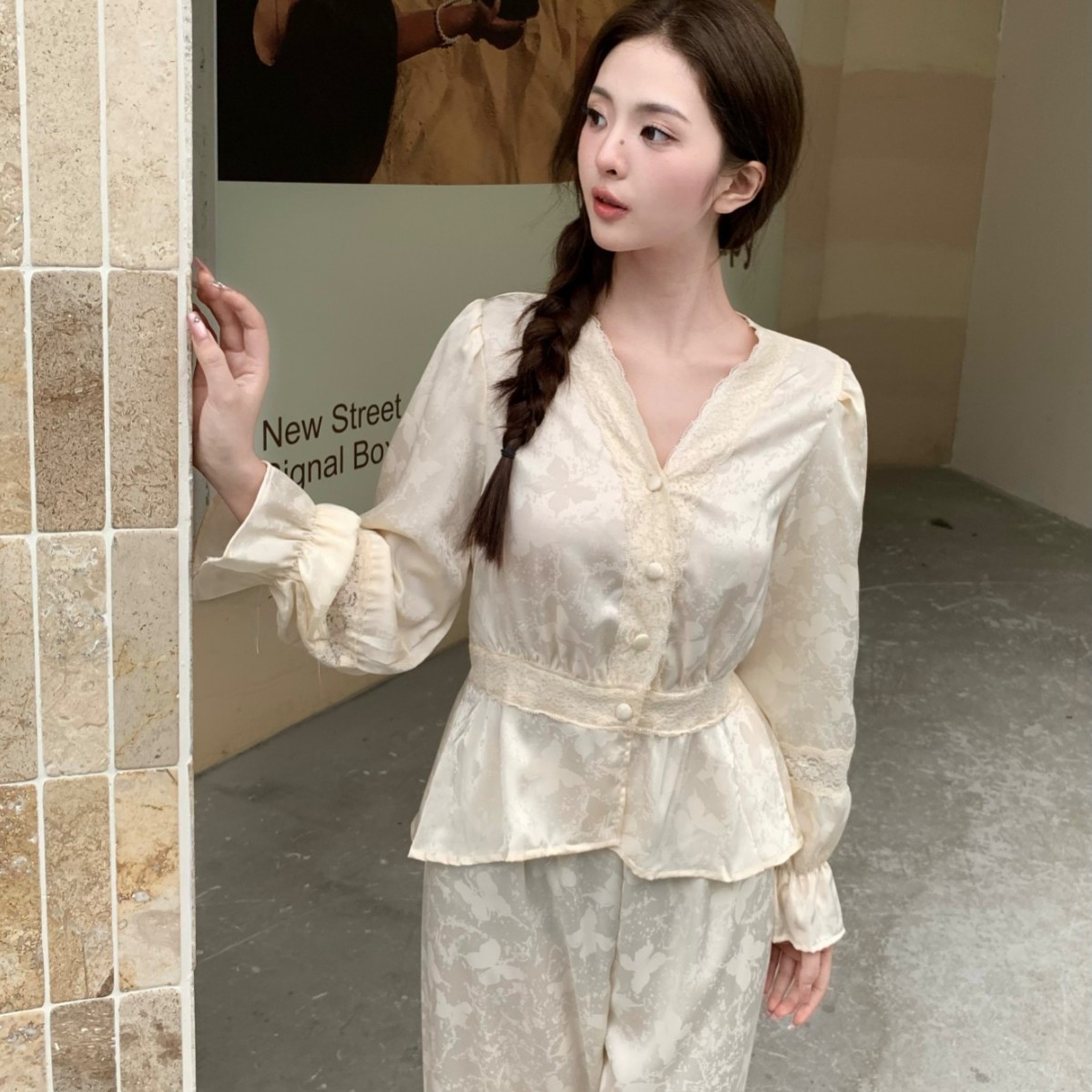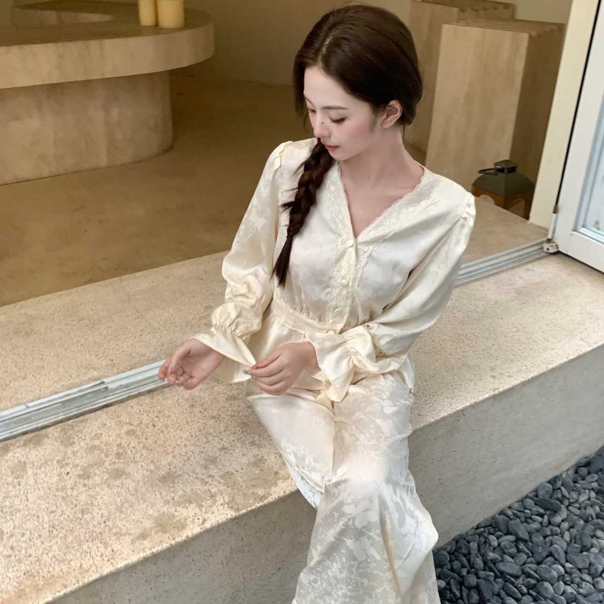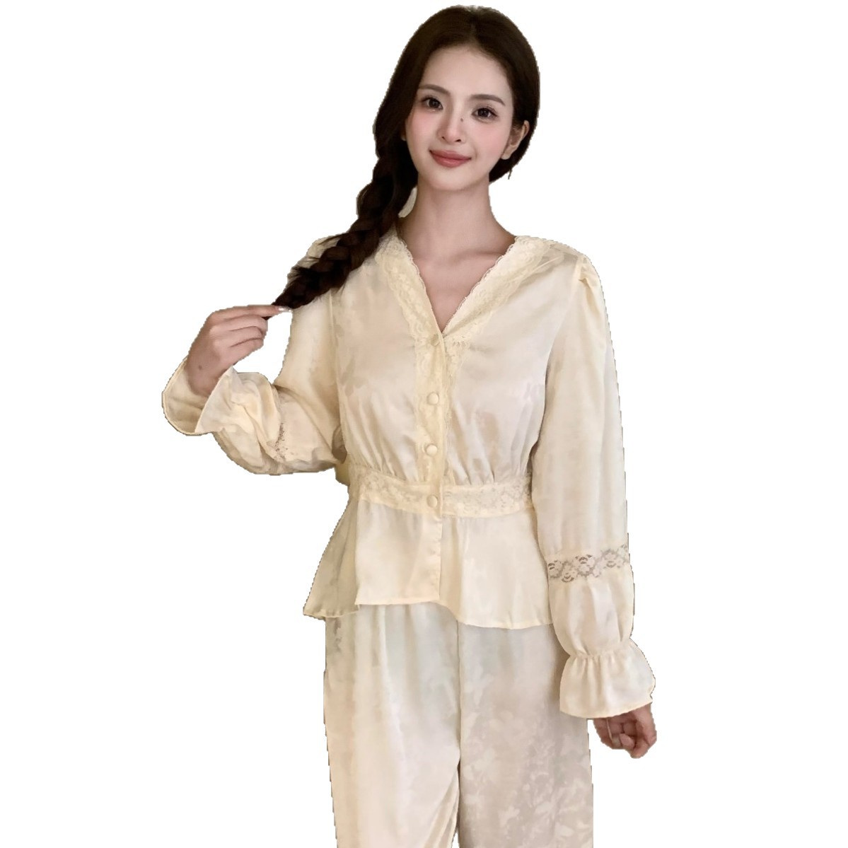 跨境V领蕾丝花边冰丝睡衣春秋女新高级感家居服女士套装批发