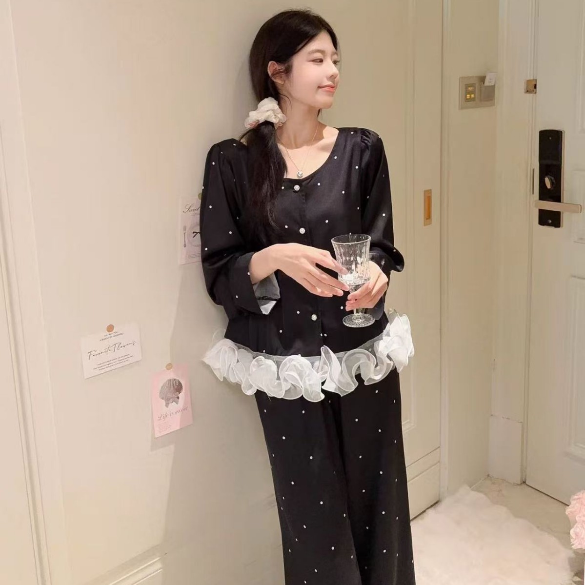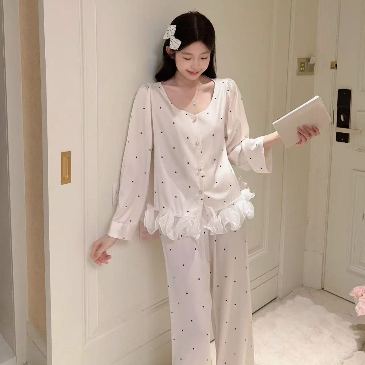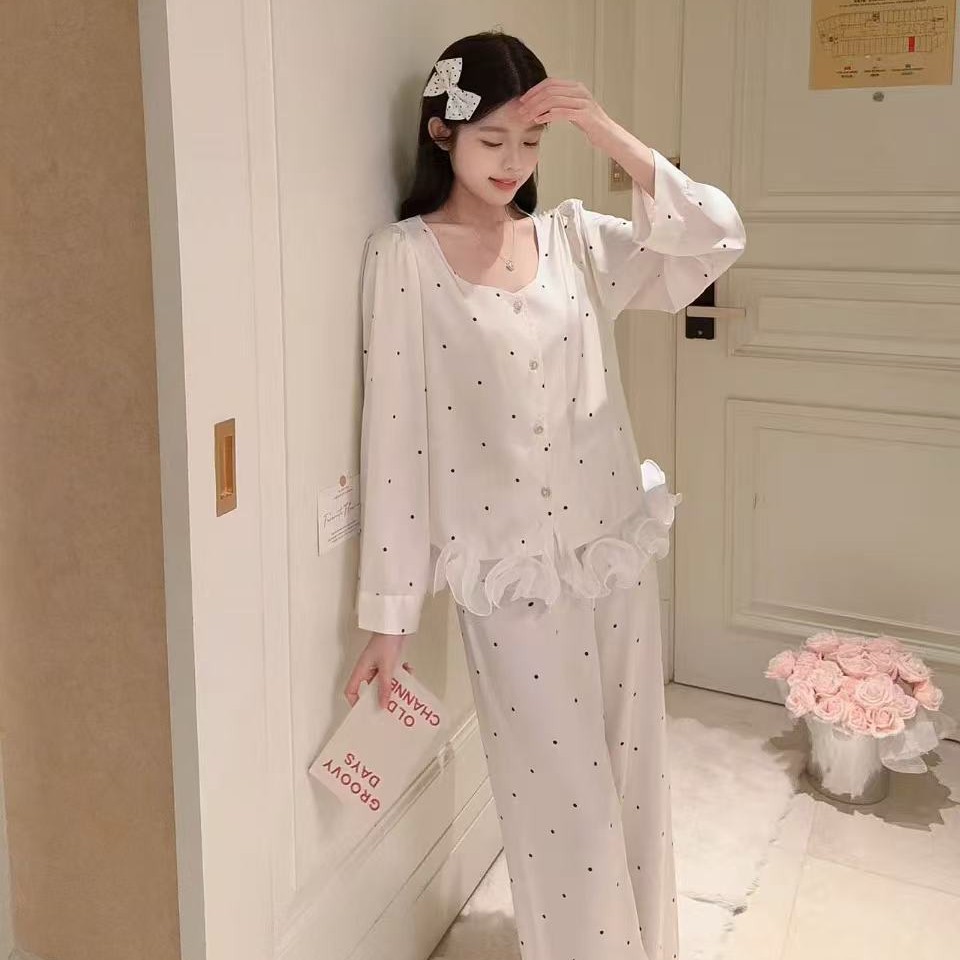 跨境睡衣女新春秋季黑白波点冰丝花边家居服套装可外穿批发