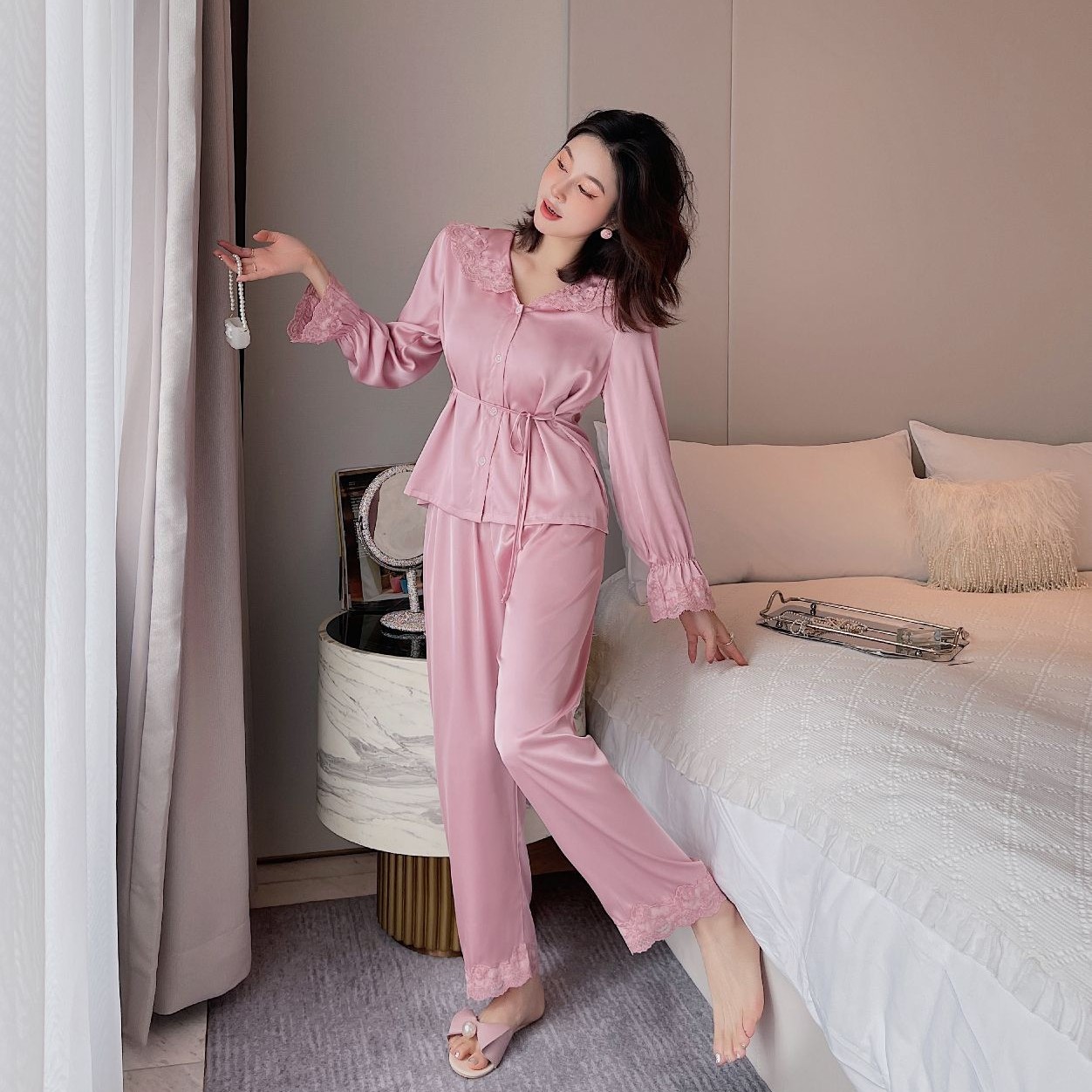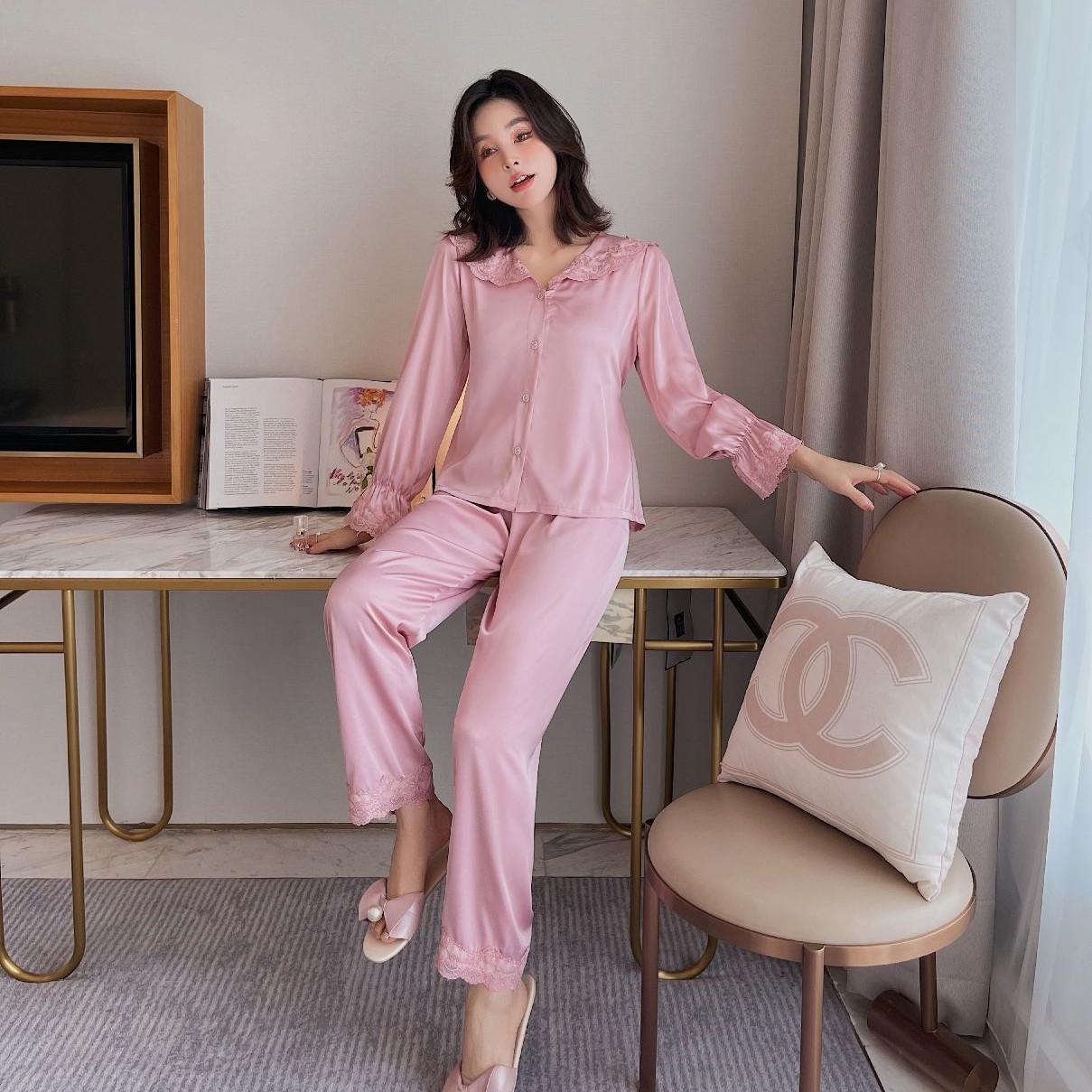 蕾丝睡衣女春秋季新两件套外贸翻领简约甜美风可爱法式家居服批发