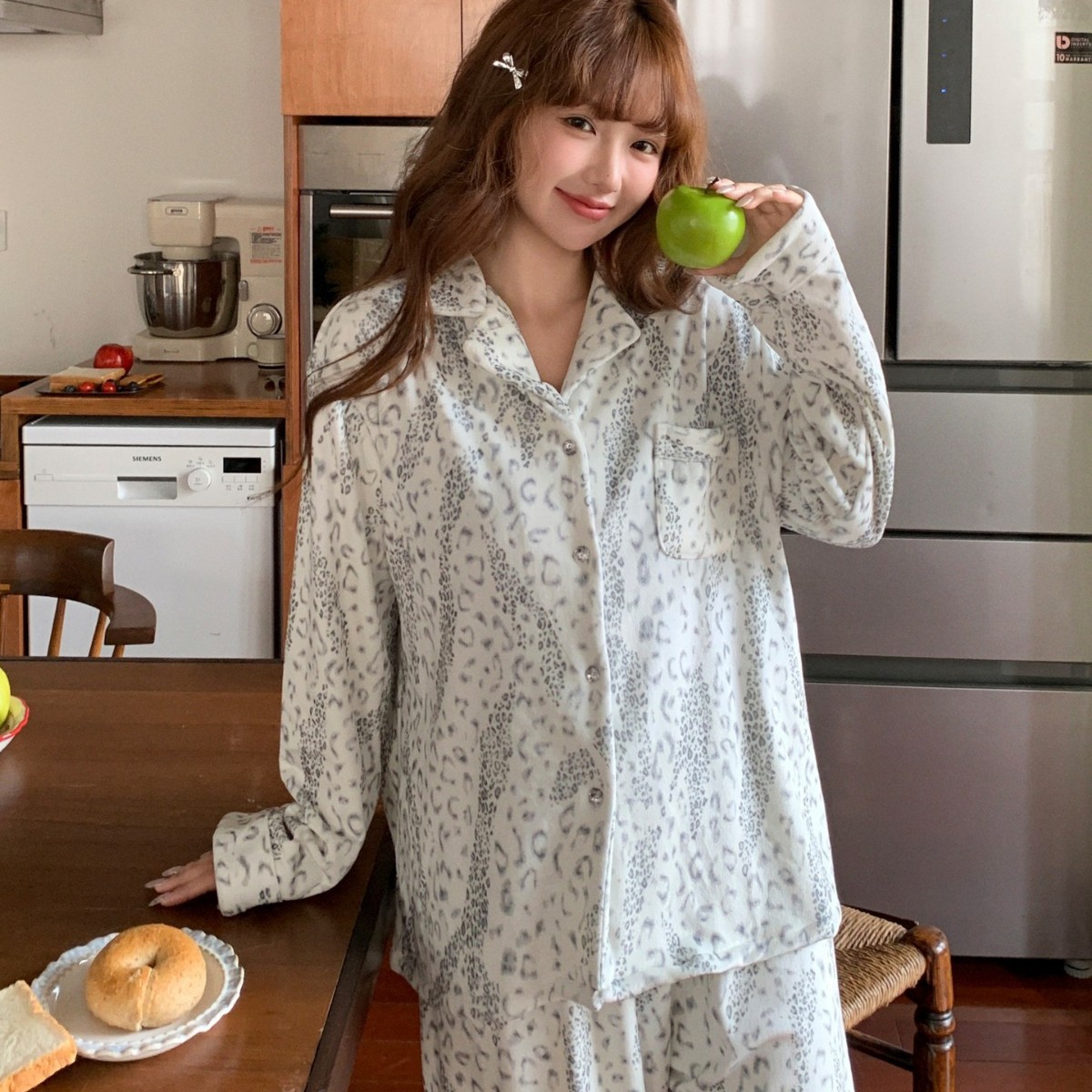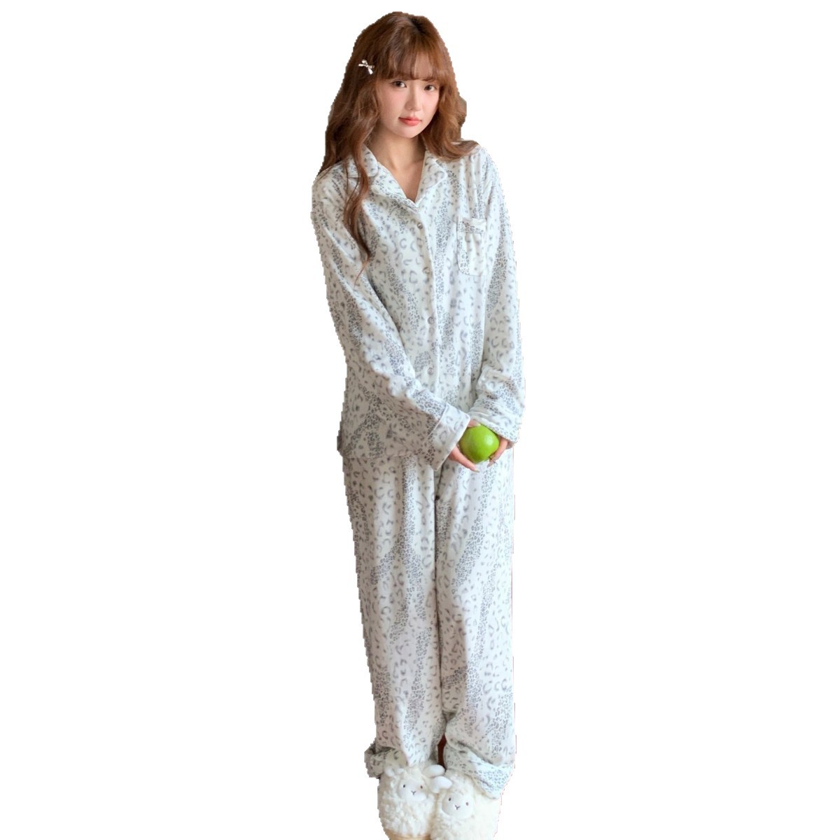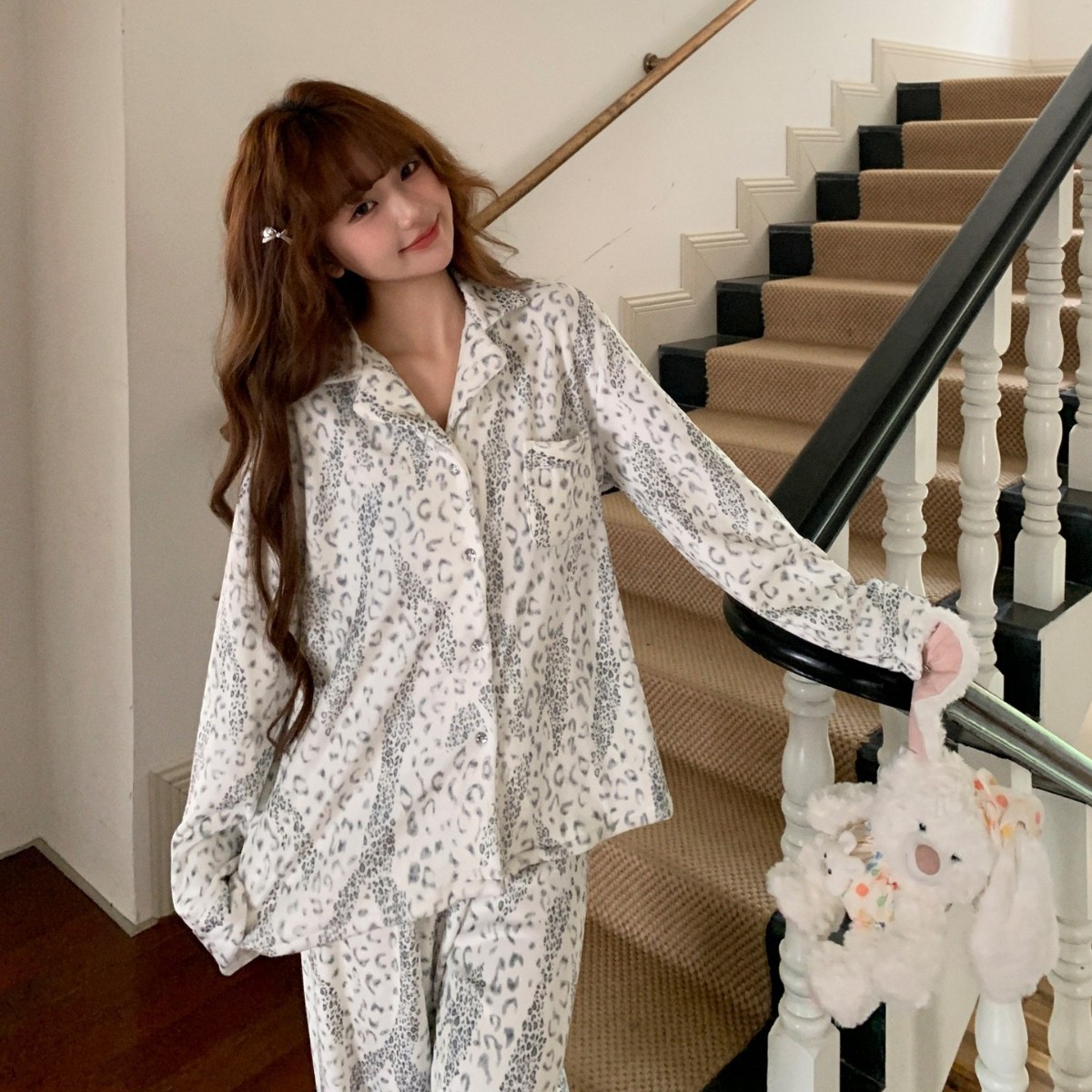 海岛绒新款秋冬季高级感法式豹纹薄绒睡衣女宽松家居服套装爆款
