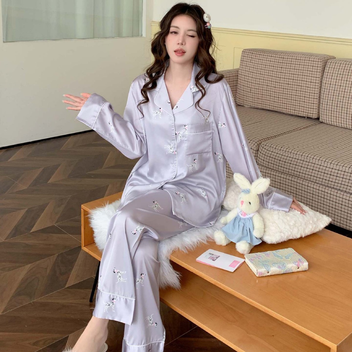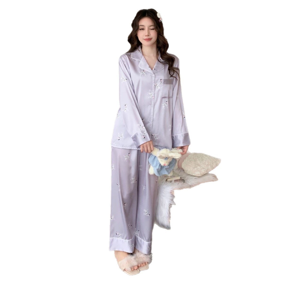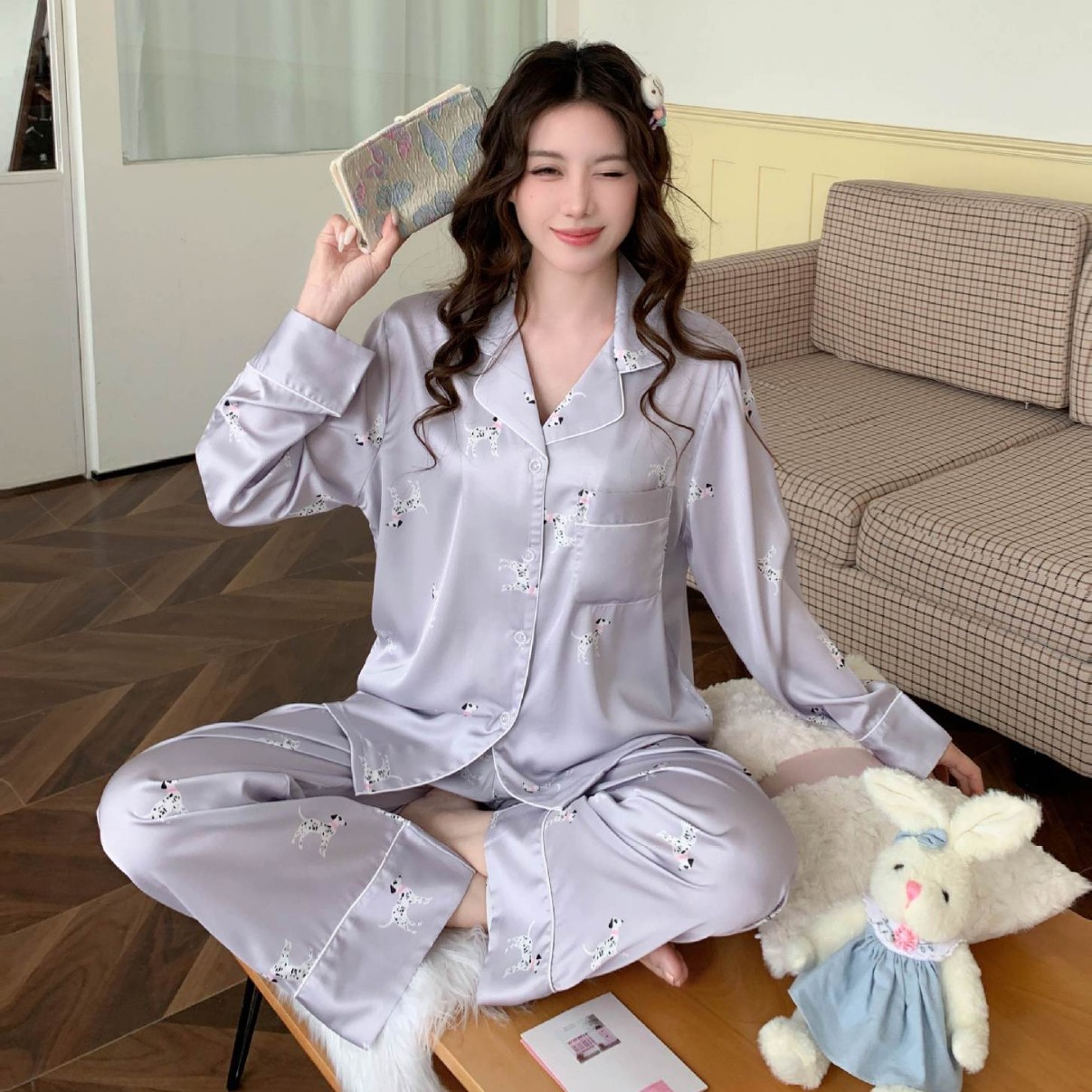 2026春季新款冰丝家居服睡衣女长袖长裤家居服女斑点狗印花套装