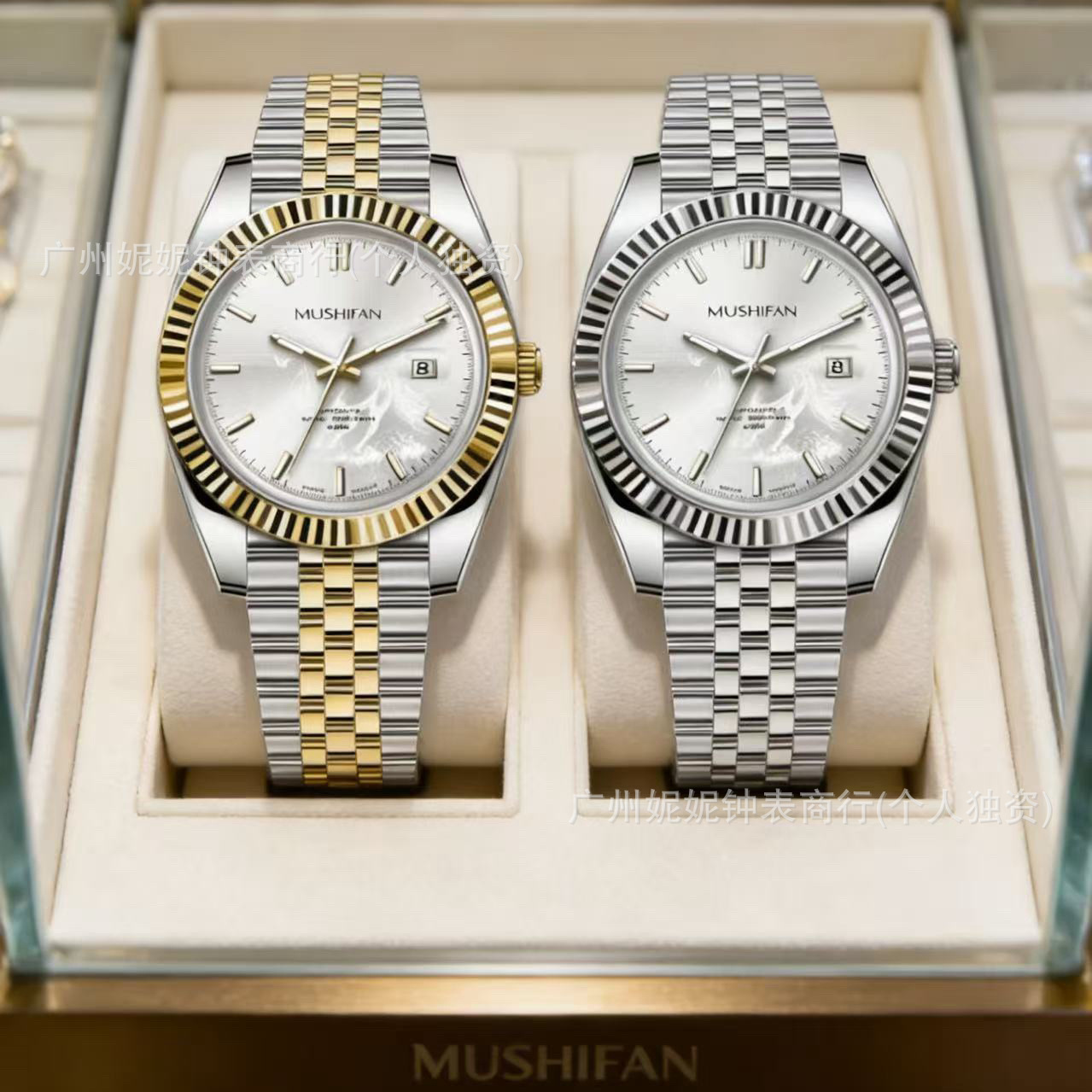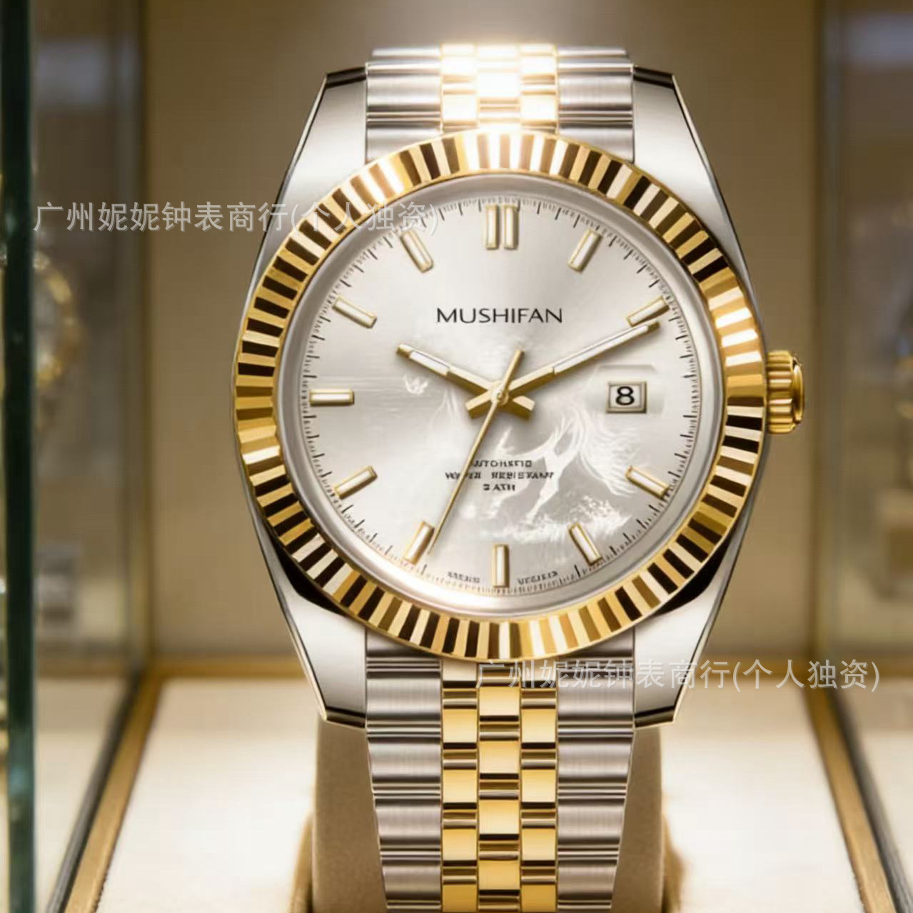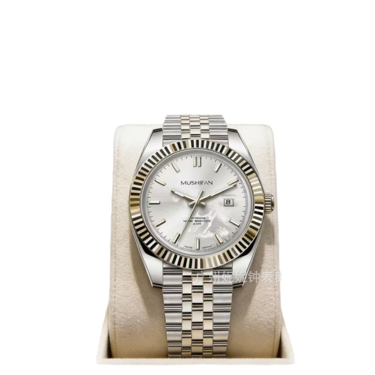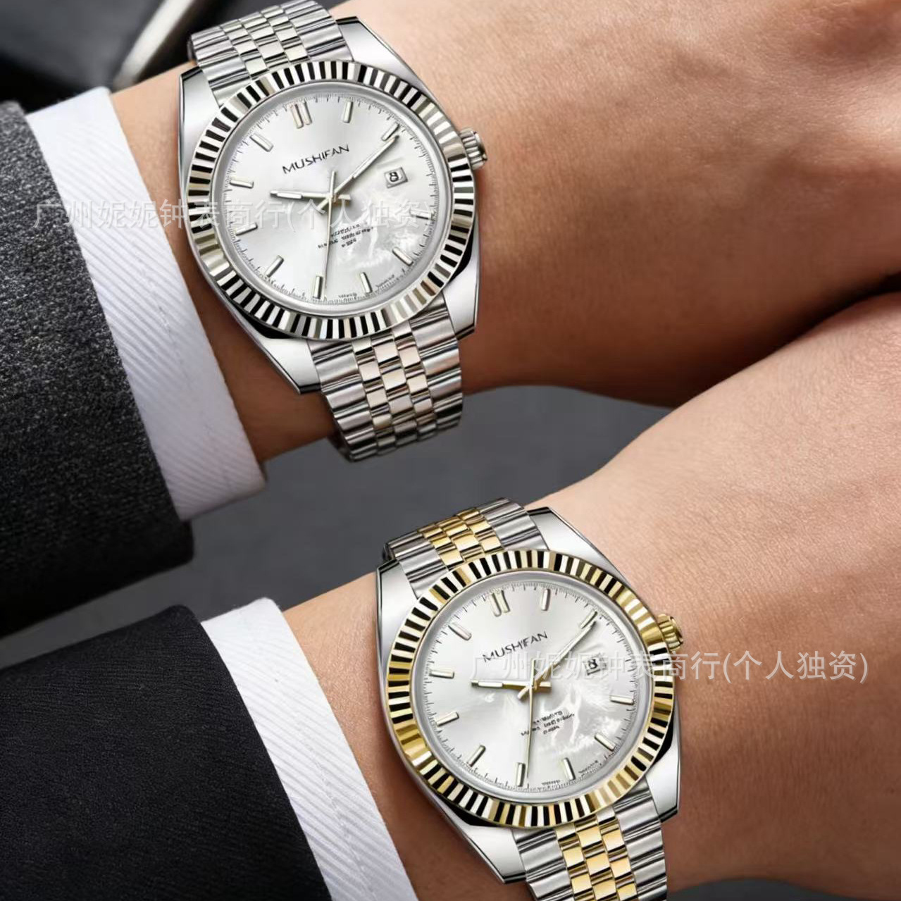 外贸热销精钢牙圈日志机械表五珠钢带手表带夜光男士表带日历批