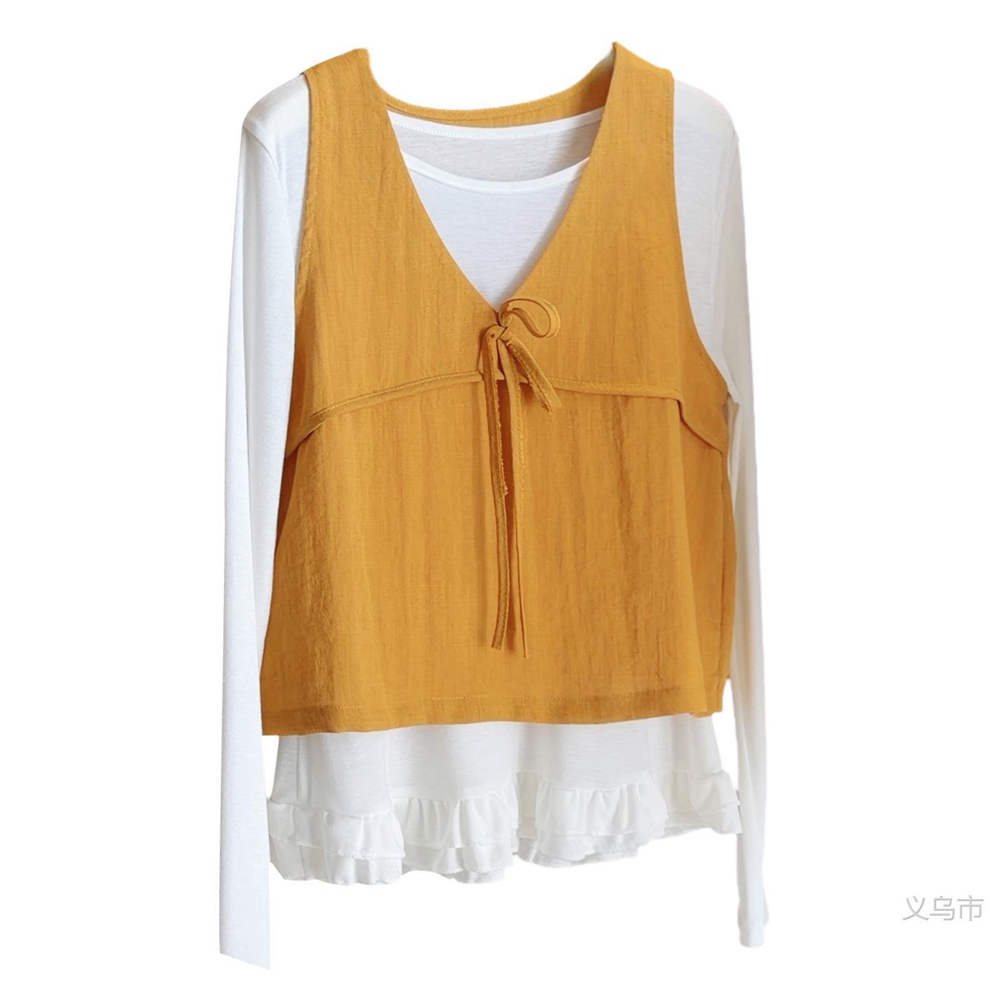 韩版绑带棉麻马甲背心女叠穿长袖打底T恤衫2026春新款时2026雅晴