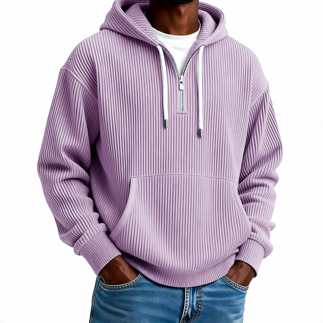2025秋季欧美跨境男装数码印花青年坑条连帽半拉链男士卫衣