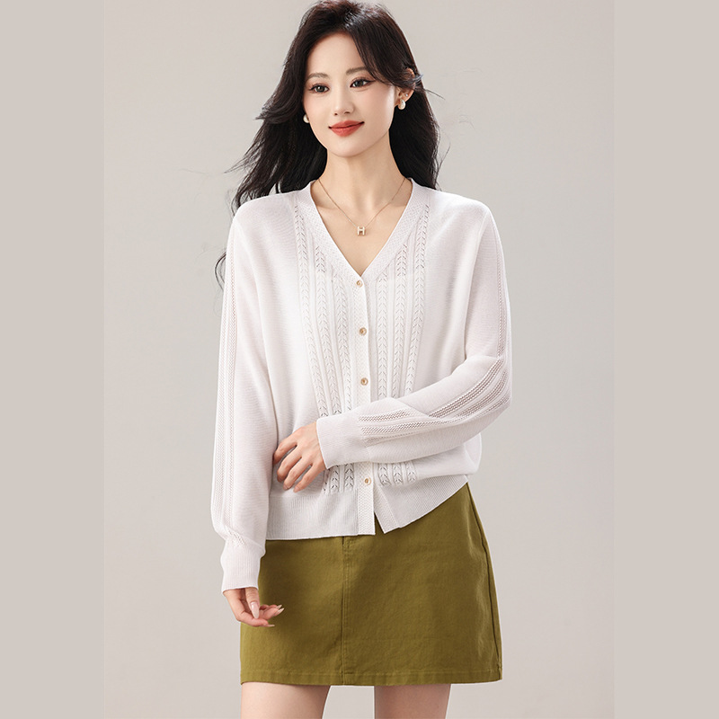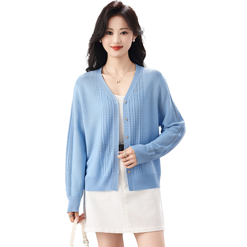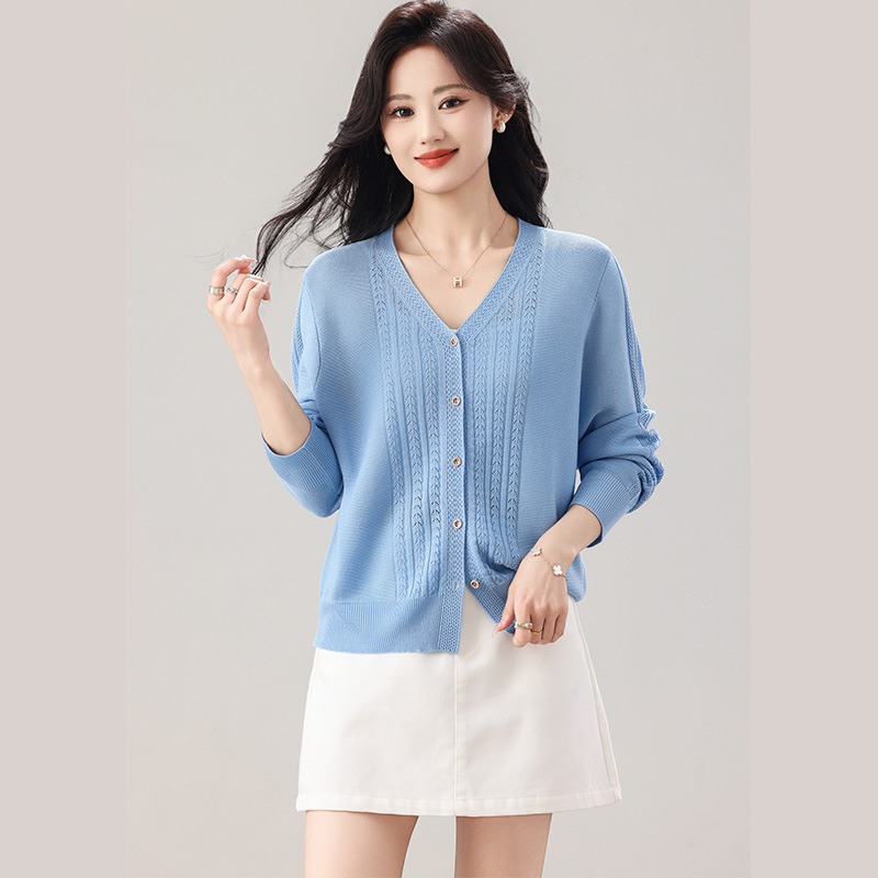 大妈女装韩版针织毛衣开衫单排扣冰丝上衣长袖钩花薄款休闲女外套