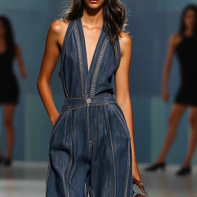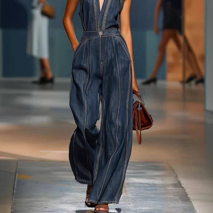 2026跨境电商外贸时尚V领休闲复古无袖阔腿牛仔连体裤亚马逊TEM