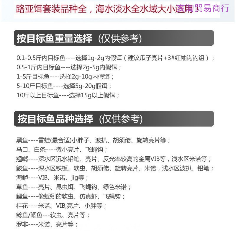 | 颜色 | 新手沉水2-10克+控鱼器+小钳实用 | 颜色 | 翘鲈2-15g(沉水铅笔VIB铁板亮片)实用 |